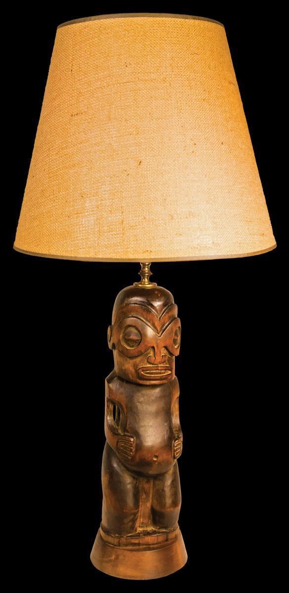 (1960s) A very rare OA warehouse showroom sample table reading lamp with shade. Features an OA Marquesan figure as the central base.20"x7" carving - 37' tall with lamp shade.VG+ with typical wear.