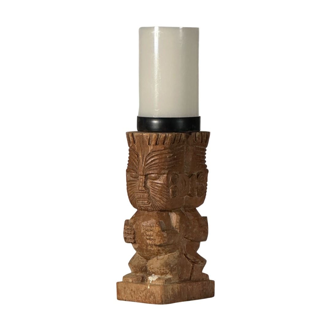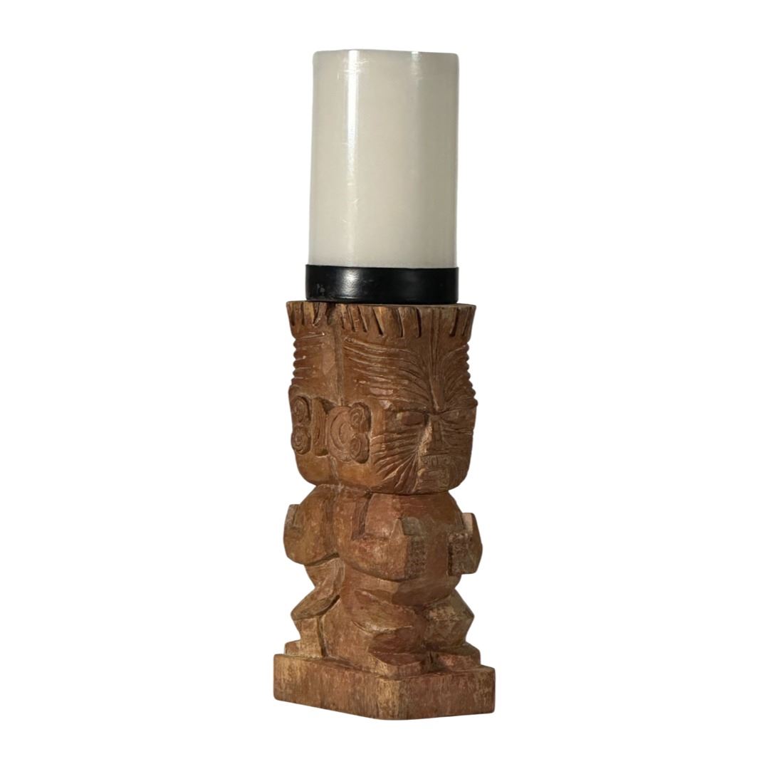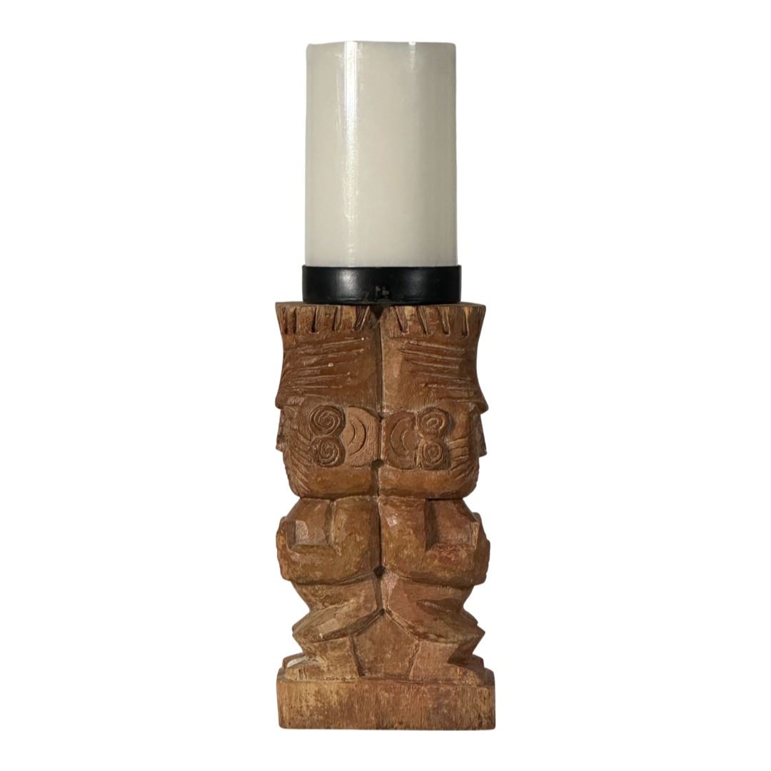 (1960s). A true rarity from the Tiffany's of Tiki venues: TRADER VIC'S. The signature Tiki logo for Vic Bergeron's Trader Vic's, THE OUTRIGGER & THE TRADER'S restaurants. This classic Tiki table lamp is a testament to the high concept presentation that Trader Vic's is known for. The carving is highly detailed and sharp, featuring the "Janus-Style" double Maori figure, back to back and topped with a plastic cylinder shade. 13.5"x4". VG+ with typical wear.