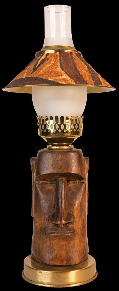 (1960s) The OA classic. Features the hardwood carved figural base with plated brass hardware, frosted hurricane glass chimney and tapa and brass shade.16.5"x7".VG+ with minor wear.