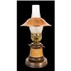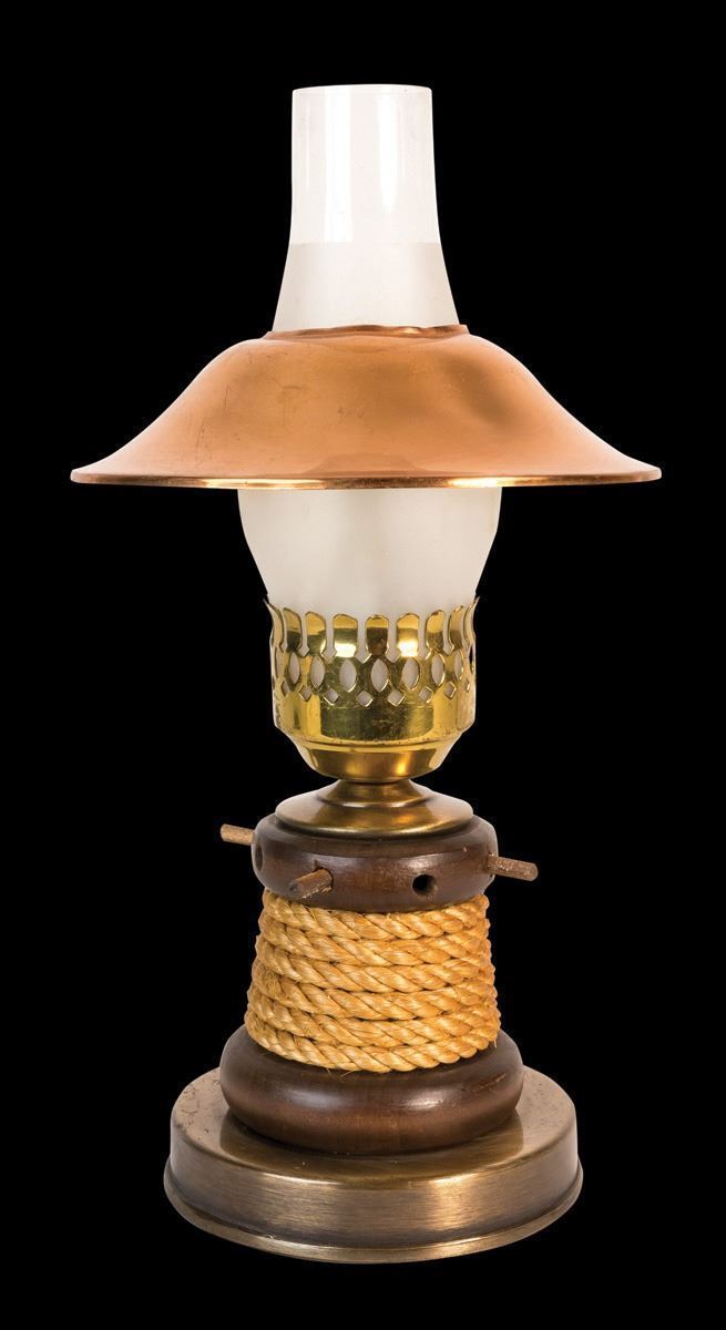 (1960s) Turned hardwood replica of a ships capstan wrapped with jute rope. Brass fittings and a nice copper plated shade.16"x7".VG+ with minor wear.