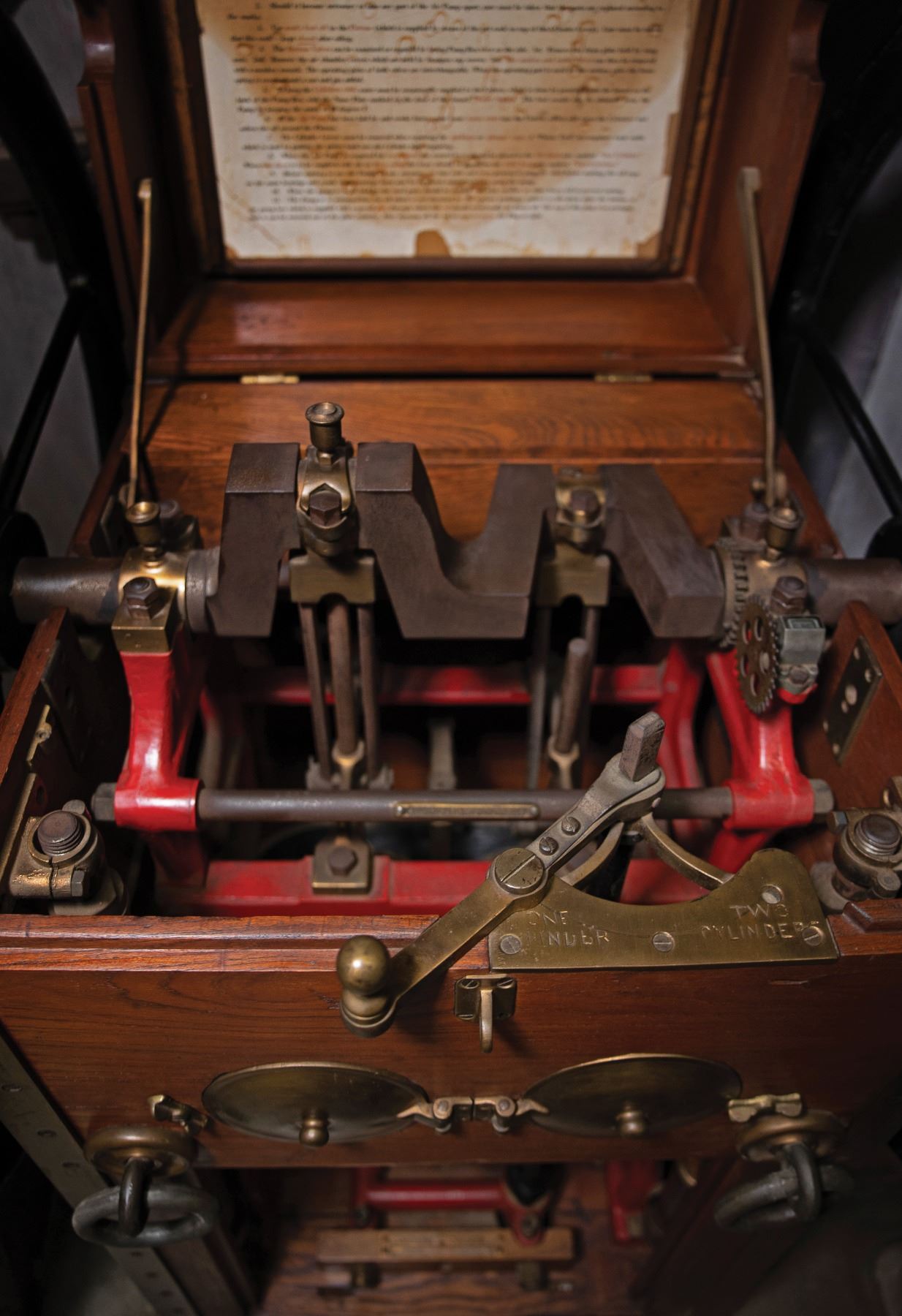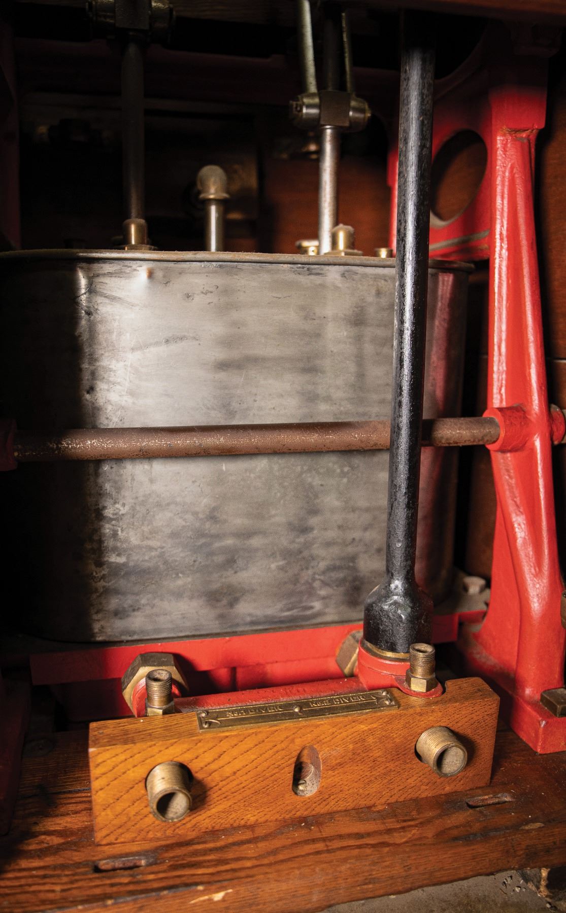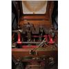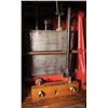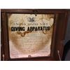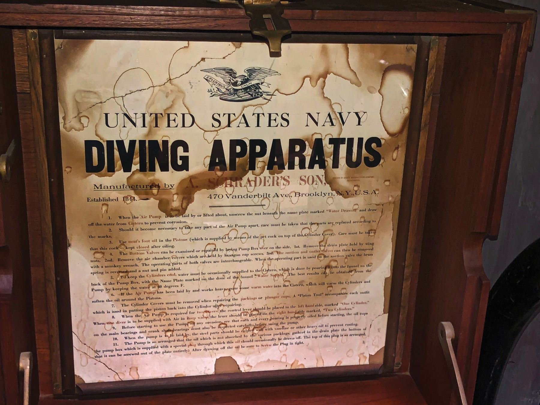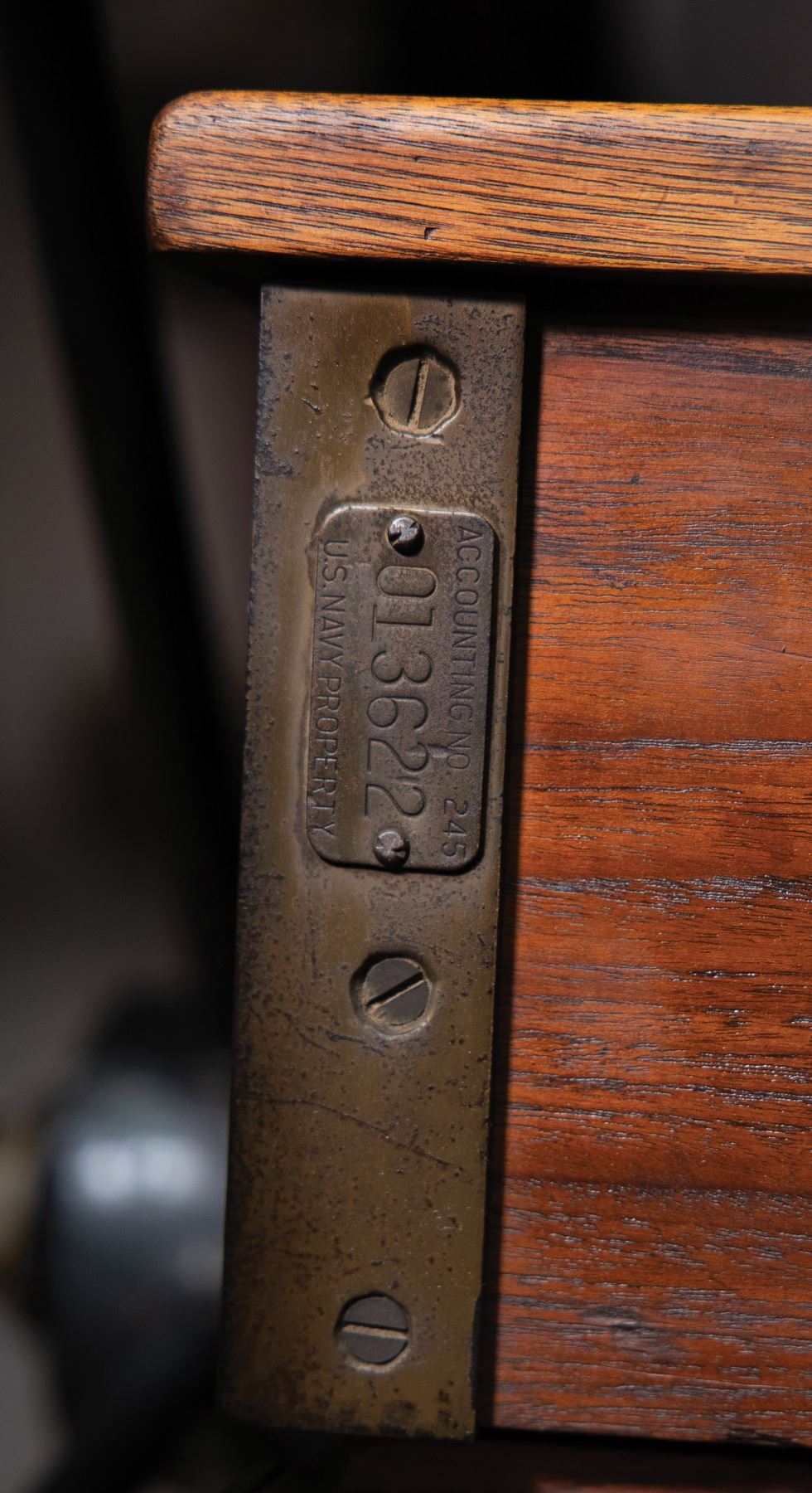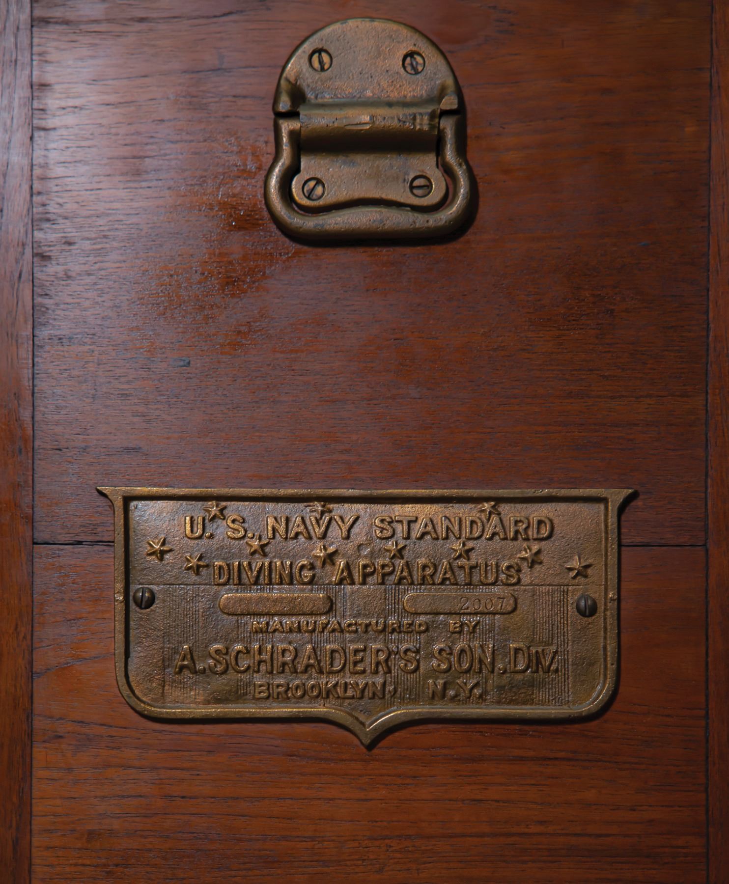 (1930s) A absolutely gorgeous, original US Navy dual-diver air pump apparatus. In its original oak case with much of its original parts and hardware. This incredible piece has been in the Oceanic Arts nautical collection for over 50 years. Schrader stamped parts, wood cylinder cranks, brass crank covers and manufacturer tags, it also retains its original instruction placard under the hood lid. The whole case is edge lined with brass guard covers - a rare feature. The pressure gauges are not present.The wood is beautiful and it appears this has seen little use over the years. The brass latches and iron carrying rings are intact. Both wood capped flywheel handles are removable and stowed away in the case. Flywheels move freely. Water cistern is intact. The lower door appears to be a very well matched replacement as there are no port holes for the air hoses. These Shrader pumps are very rare and highly coveted. This condition is almost unheard of. Specimens of this type are only seen in very high-end private collections or museums. This pump is not being sold as fully operational and diving in LA River with it is highly discouraged. The good news is A. Schrader & Son's, established in 1887, is still in business today, providing guidance and manufacturing parts to restore their old products such as pumps and diver's helmets. Very heavy and will require special freight considerations. 59"x50"x31" as shown. VG+ with typical wear.