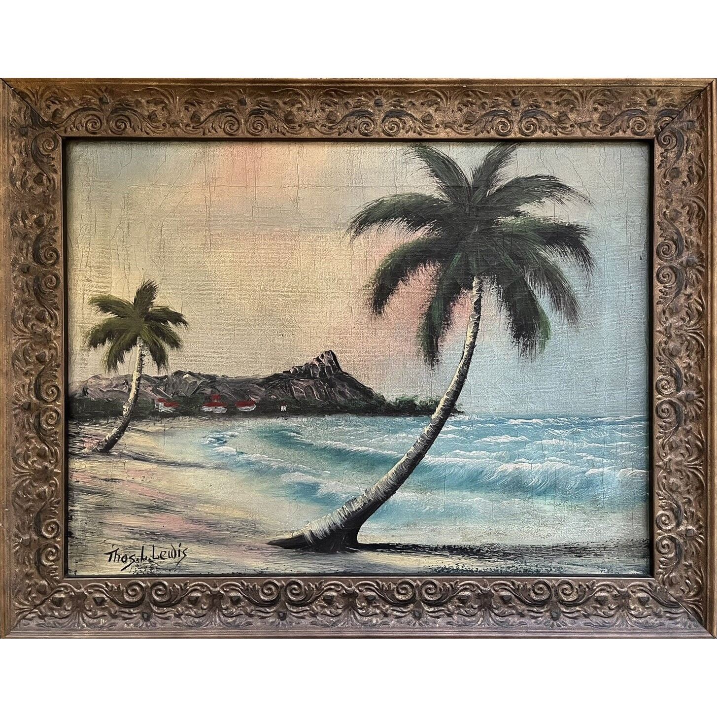 (1930s) Rare early Hawaii landscape by listed American painter, Thomas L. Lewis. Lewis was a prolific artist in the 1920s through the 1960s and highly sought for his impressionistic landscapes. Here is a very un-populated view of the beach coastline of Waikiki, dominated by swaying palms and a majestic Diamondhead crater off in the distance. Oil on canvas and signed by the artist in the lower left. Craquelure from age and general patina to the painting. In frame. 19"x15" in frame. Uninspected out of frame. VG+.