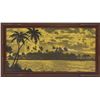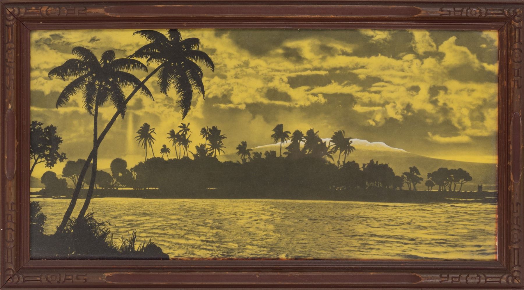 (1930s) A sepia photo print of Coconut Island, Oahu. The pale yellow tint gives this panoramic view of a tropical island a hazy, romantic depiction of a bygone era faded into memory. Captivating photography with dark wood frame. 22.25"x12". VG+.