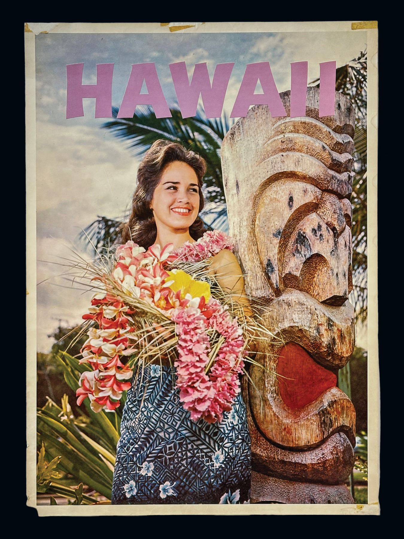 (1950s) An original general travel poster from the 1950s featuring a nice Tiki carving. VG with edge tearing, chipping and some margin tape staining. See photos. 25.5"x35.5".