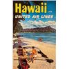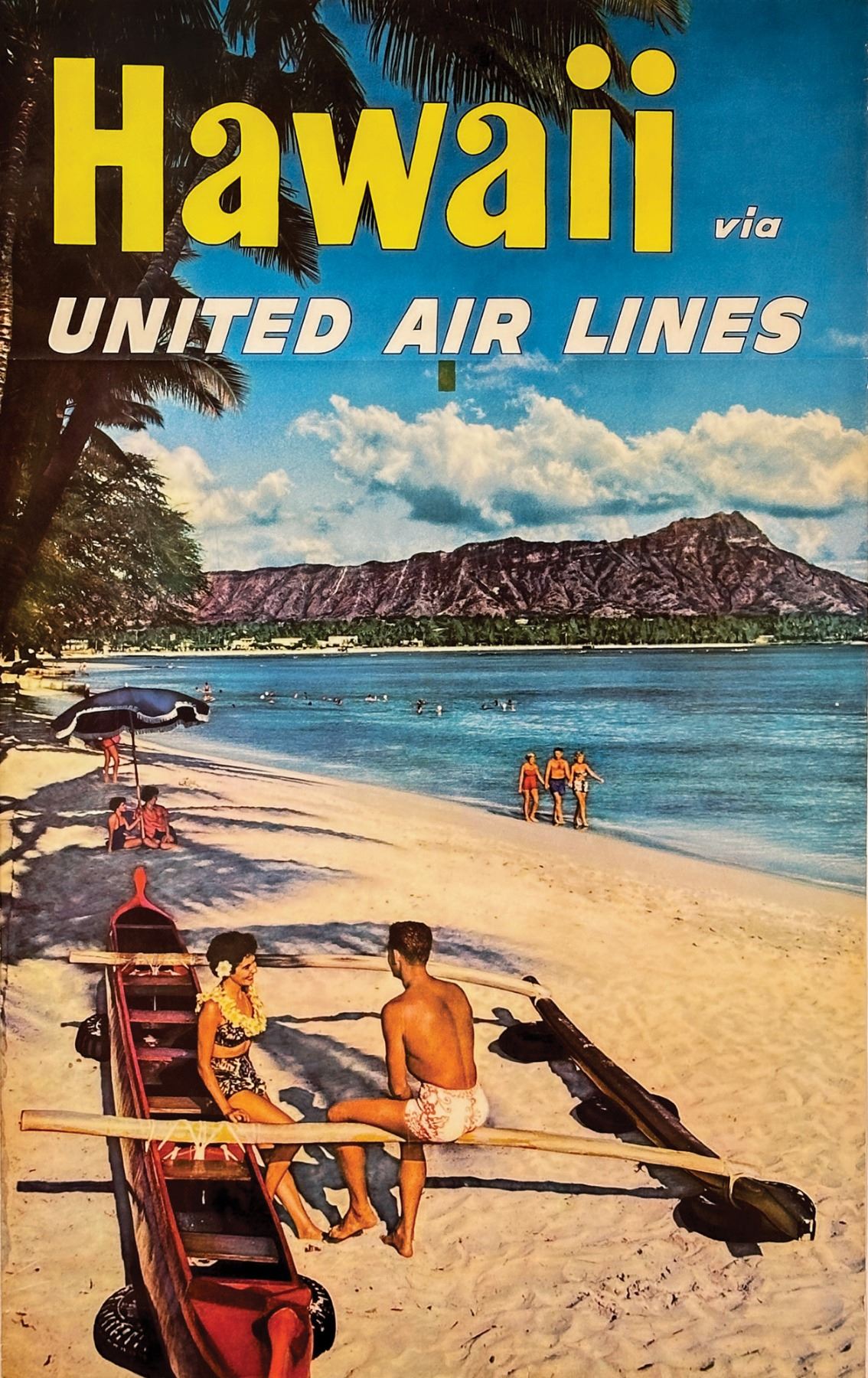 (1950s) Breathtaking photo litho image of an outrigger against the backdrop of Diamondhead on the beach at Waikiki. VG+ with a light center fold crease and a 1" piece of aged tape. 25"x39.5".
