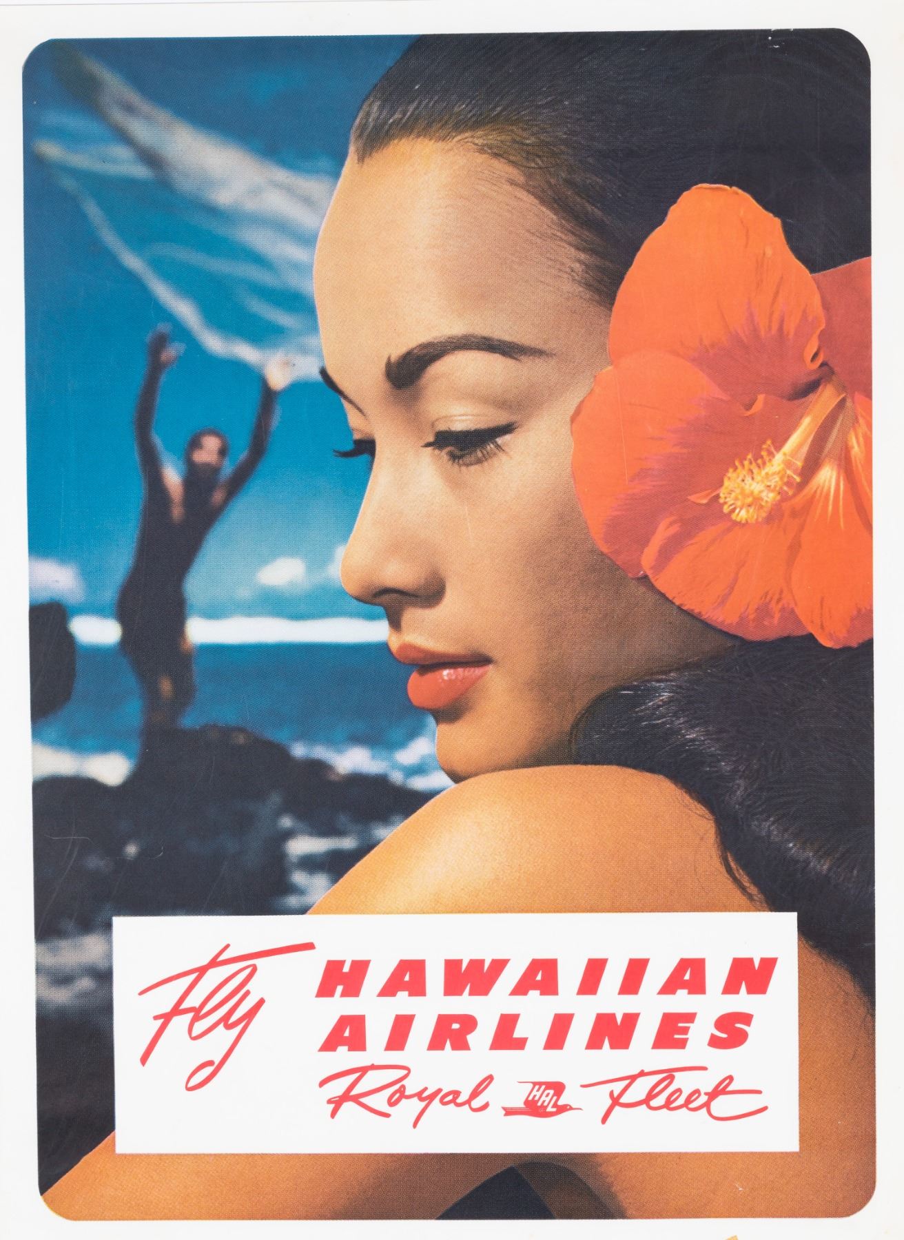 (1950s) Beautiful technicolor-esque color photo litho poster for Hawaiian Airlines "Royal Fleet" service to the islands. Rolled. 21"x28.5". VG+ with minor edge wear and small discoloration in the margin.