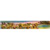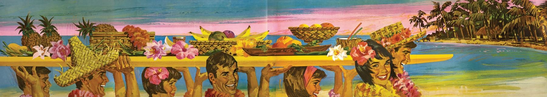 (1960s) A very fun illustration of a group carrying a bounty of goodies atop a surfboard on the way to a hukilau or clambake no doubt! Exceptional graphics to accent your Polynesian party space. This oversized poster has been conservation mounted on linen, ready for framing. VG+. 116"x23.5".