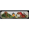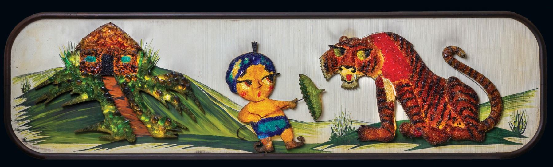(1960s). Dazzling gravel art wall panel from Sambo's restaurant with Sambo fending off an adult Tiger with his parasol. Exceptional background art! Wall panel #2 in a series. Wood with colored glass pieces.Some chipping and staining. *The lighting in the auction photo is for reference only. Panels do not come with electrical hardware but can be fitted for backlighting. VG+. 60"x16".