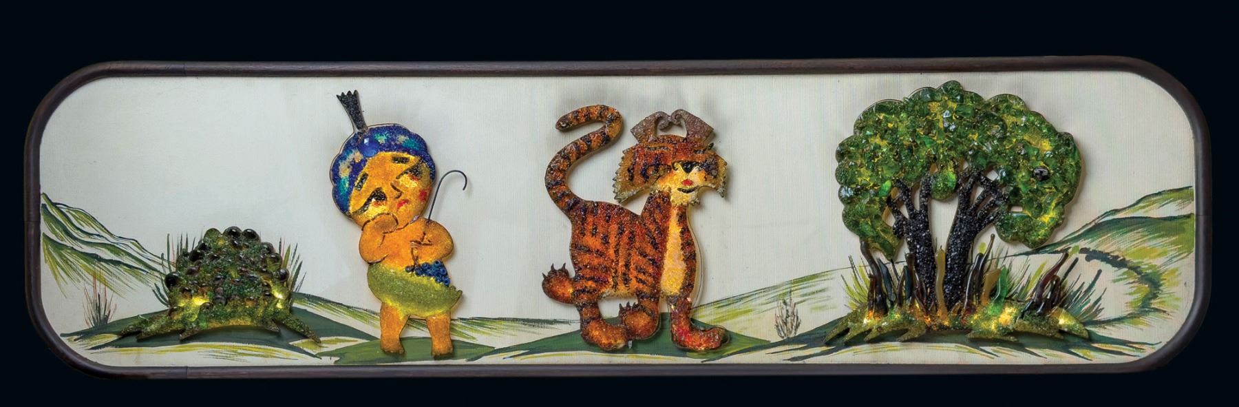 (1960s). Adorable gravel art panel features the Sambo restaurant Sambo being casually rejected by the adult Tiger. Wonderful piece of emotional imagery in the full story. Part #4 of the series of wall panels. Wood with colored glass pieces. Some chipping and staining. *The lighting in the auction photo is for reference only. Panels do not come with electrical hardware but can be fitted for backlighting. VG+. 60"x16".