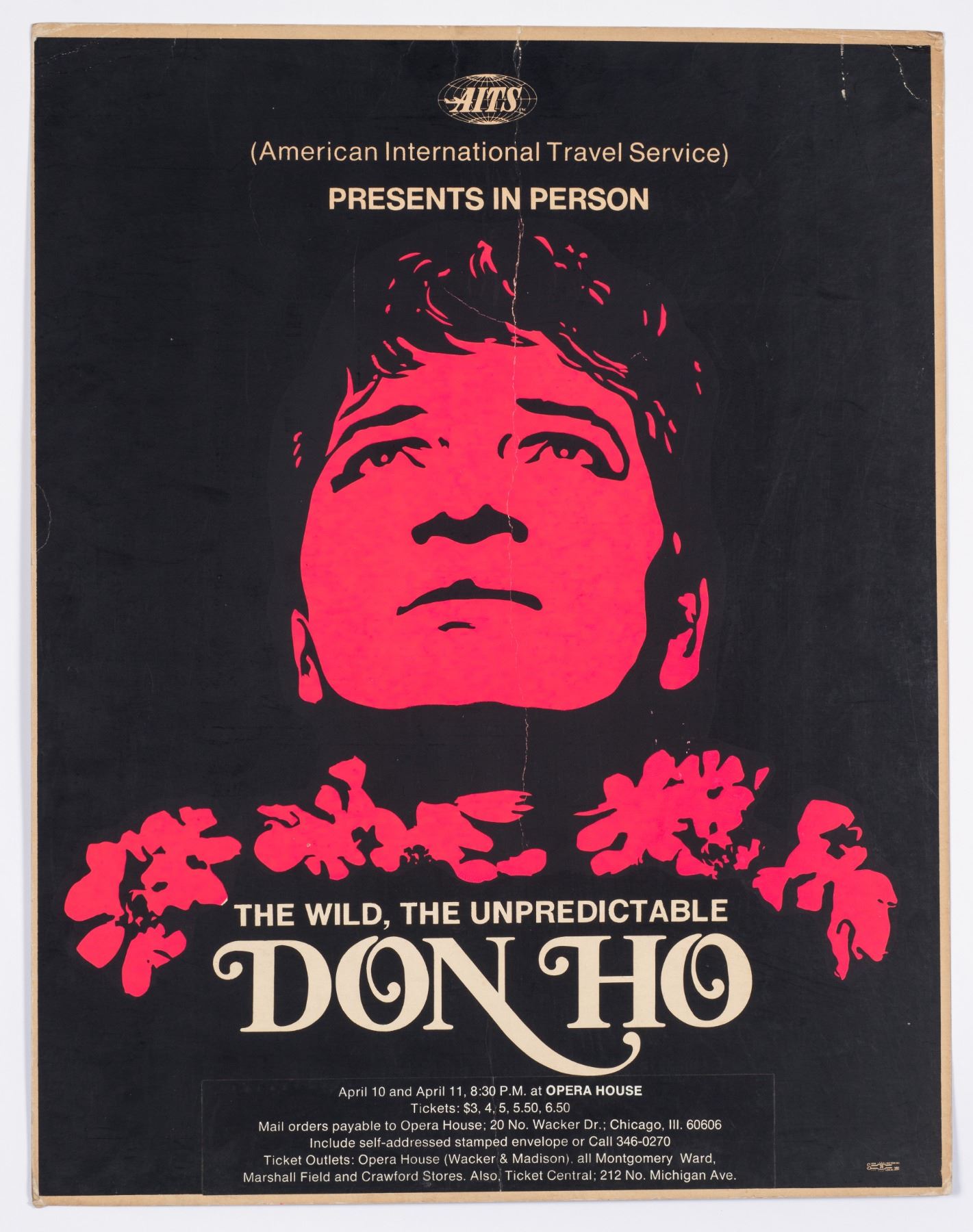 (1960s) A very striking, original concert appearance poster for "The Wild, The Unpredictable DON HO" tour. This particular poster promotes the Chicago, Illinois date of the run. The poster is hand-pulled silkscreen in fluorescent hot pink and black on thick poster cardstock. Scarce. 22"x28". VG- with some color breaks in the black from creasing in the center, yet not fully folded. Also creasing on the corners and some edge wear.