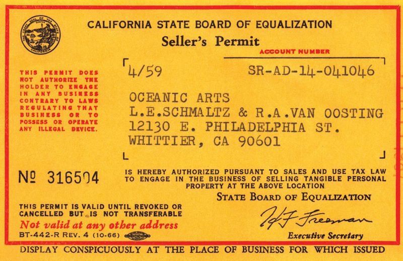 (1967) A renewal of the California seller's permit for OA once the 901 West address was reassigned to 12130 E Philadelphia St.3"x5".EX