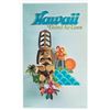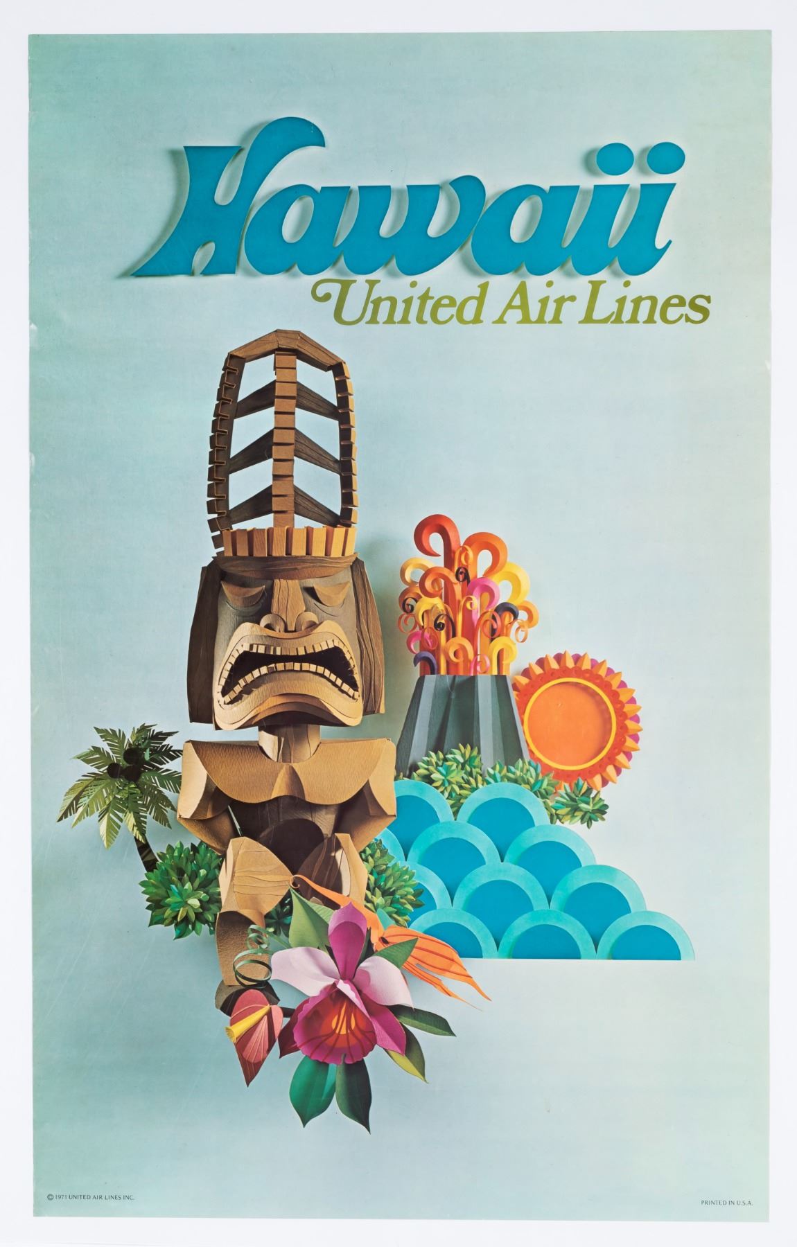 (1971). A fun photo lithography poster for United Airlines service to Hawaii. Featuring an elaborate paper cut out collage featuring a 1970s stylized Lono Tiki God. Rolled. 25"x40". VG+ with minor edge wear.