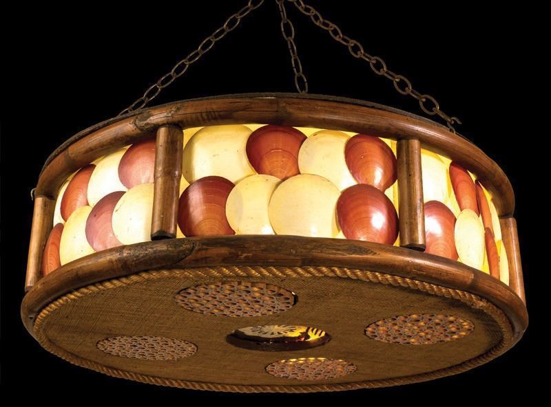 (1960s) A spectacular OA design from the mid-1960s. This particular lamp was purchased back from The Pago-Pago in Arizona and used as an OA warehouse display sample. These were very expensive to manufacture at the time and it certainly shows in the craftsmanship. Formed rattan with red and white shells surround the lamp, giving off a unique glow. The abaca underside of this large lamp is a work of art onto itself with recessed bamboo section trivets, a tapa covered center and a jute rope border. Extremely rare.28"x8.75".VG+ with typical wear.