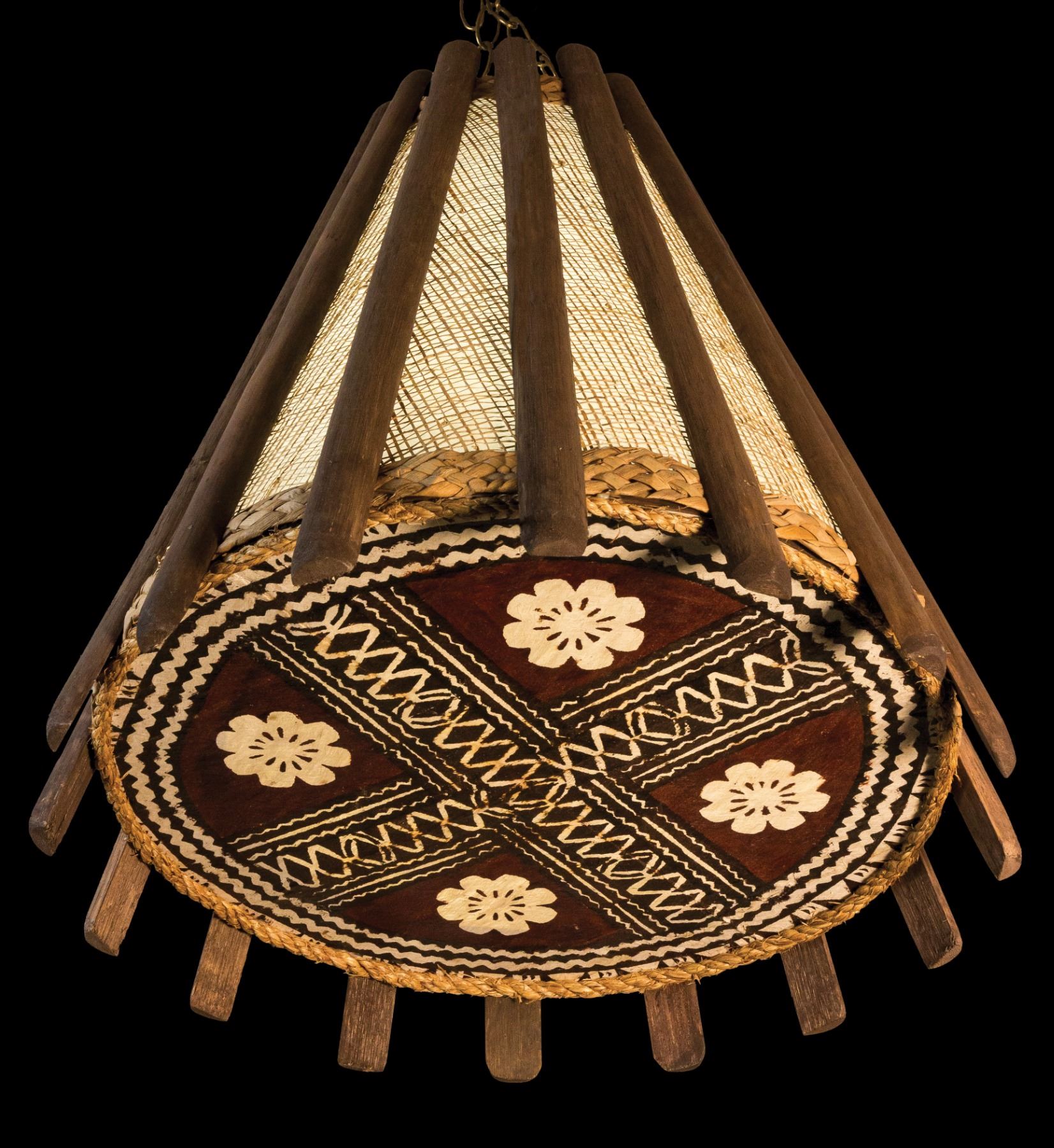 (1960s) Hands down, THE most classic creation of OA for the Poly-Pop world. This handsome lamp is a modernist interpretation of the Tahitian Cone Fishtrap, lined with fiberglass and Abaca matting for the body, rattan slats and a graphic tapa cloth bottom. 24"x20". VG+ with typical wear.