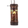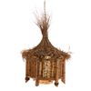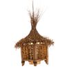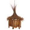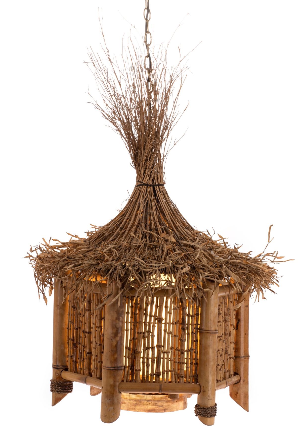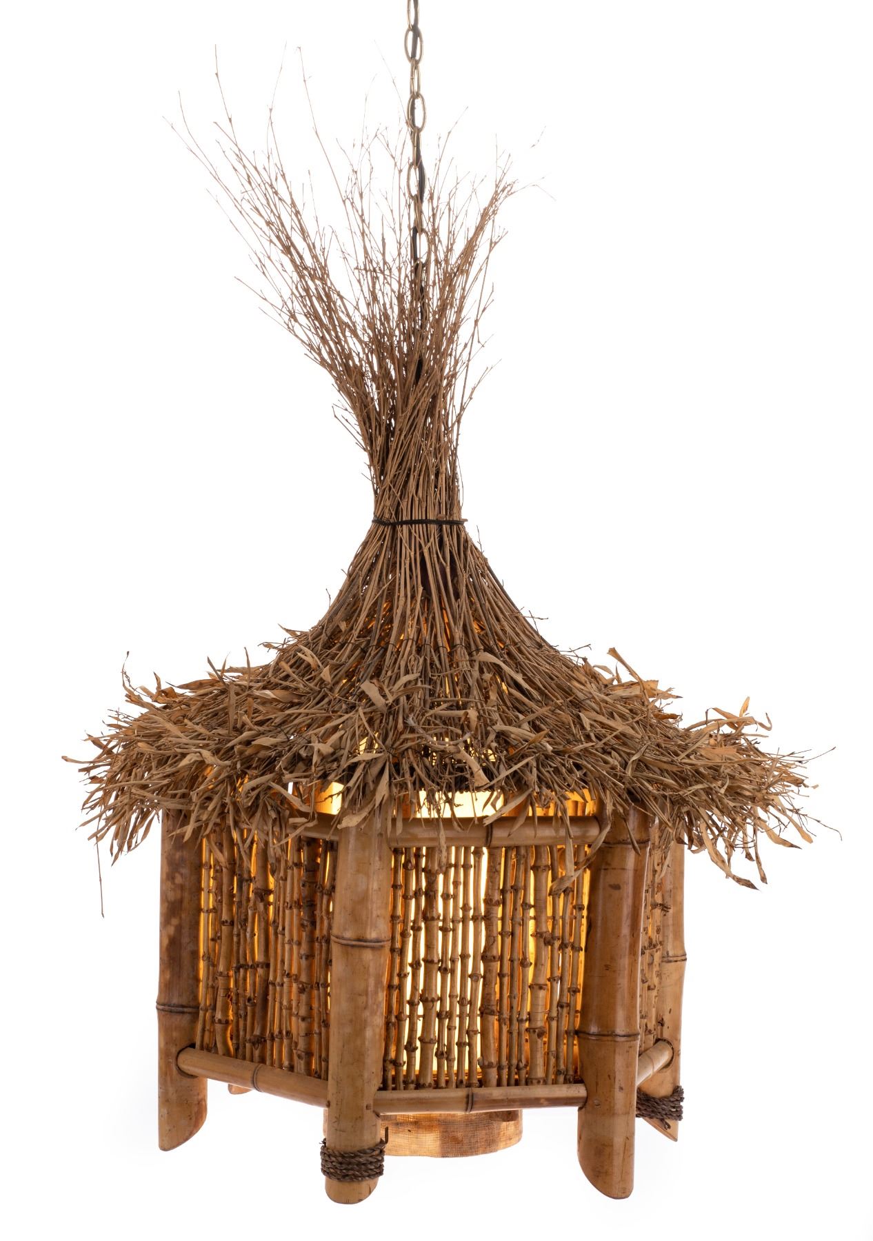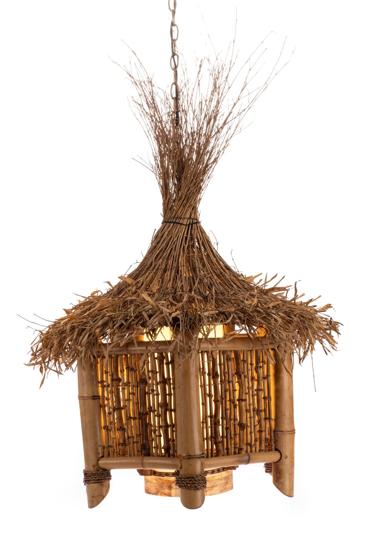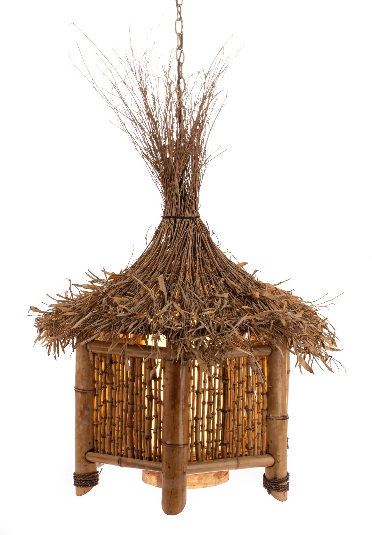 (1990s) Another variation of the "Hilo Thatch Shade" OA lamp. Here, a Cluster free form raffia top makes an enchanting thatched Tiki hut hanging lamp. With thick bamboo frames and thin stick bamboo sides. Twine wrapped end pieces. Fully functional electric lamp with hanging chain. 36"x24". VG+ with typical wear.
