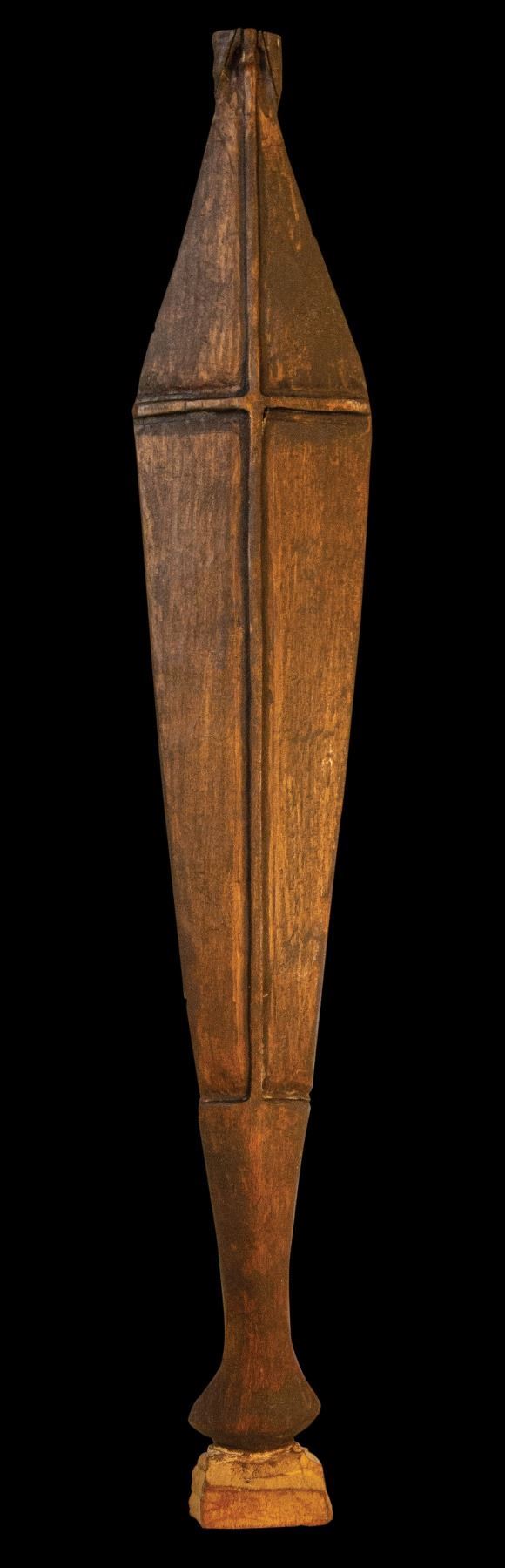 (1960s) Also known as a Fijian Throwing Club, this is another master OA pattern. Spindle chocks present. 30"x4.5". VG+ with typical wear.