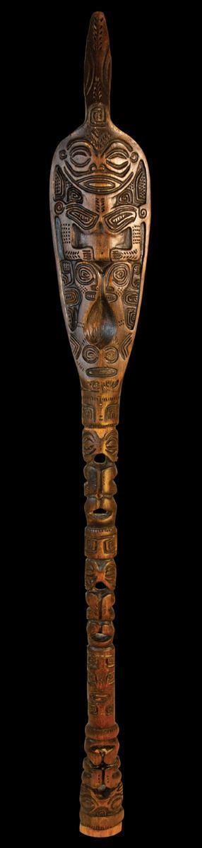 (1960s) An incredible OA piece of art. This Tahitian Paddle features fine details and is carved on both sides. Some repairs. Spindle chocks present.49"x6".VG+ with typical wear.