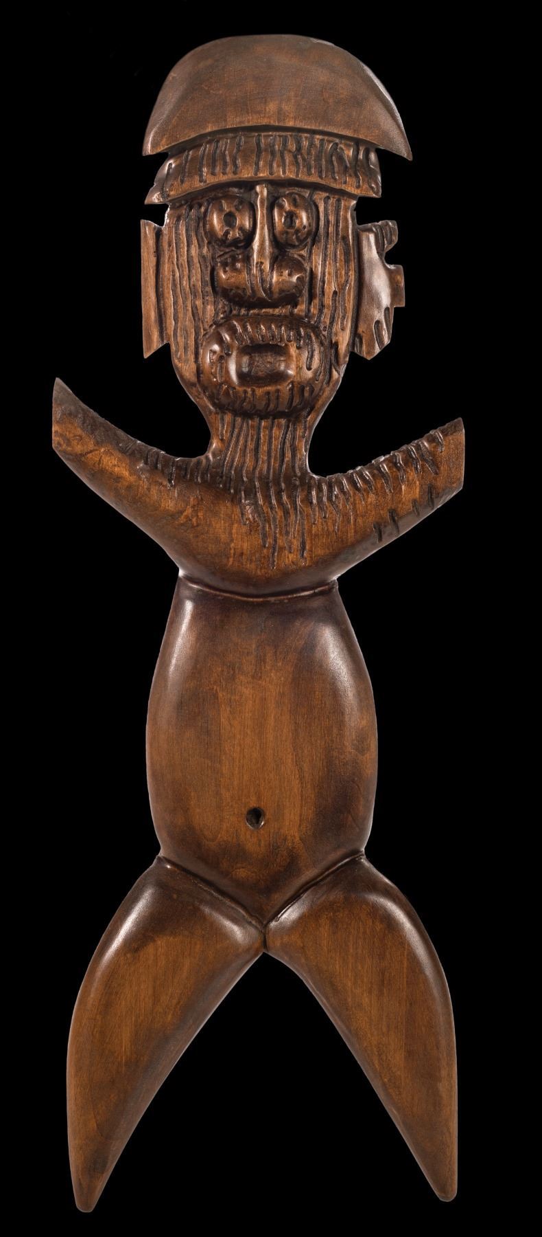 (2000s) A modern carving of a perennial OA catalog tiki. Based on a New Guinea museum specimen encountered by the boys on their Big Trip, this wall figure is an Oceanic Arts classic, gracing the walls of some of the biggest destinations of Tiki's golden era. 36"x12". VG+ with typical wear.