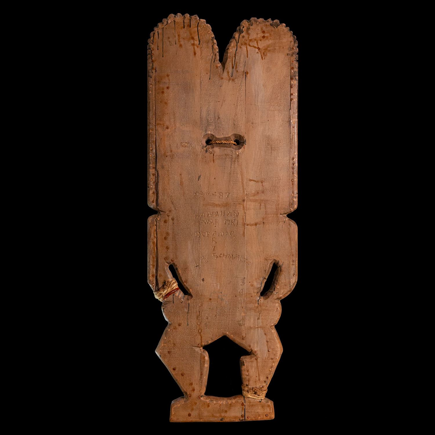 (2000s) A LeRoy carved and painted wall panel of KU, the Hawaiian War God Tiki. Signed carved on the back by LeRoy Schmaltz. 48"x18". VG+ with typical wear.