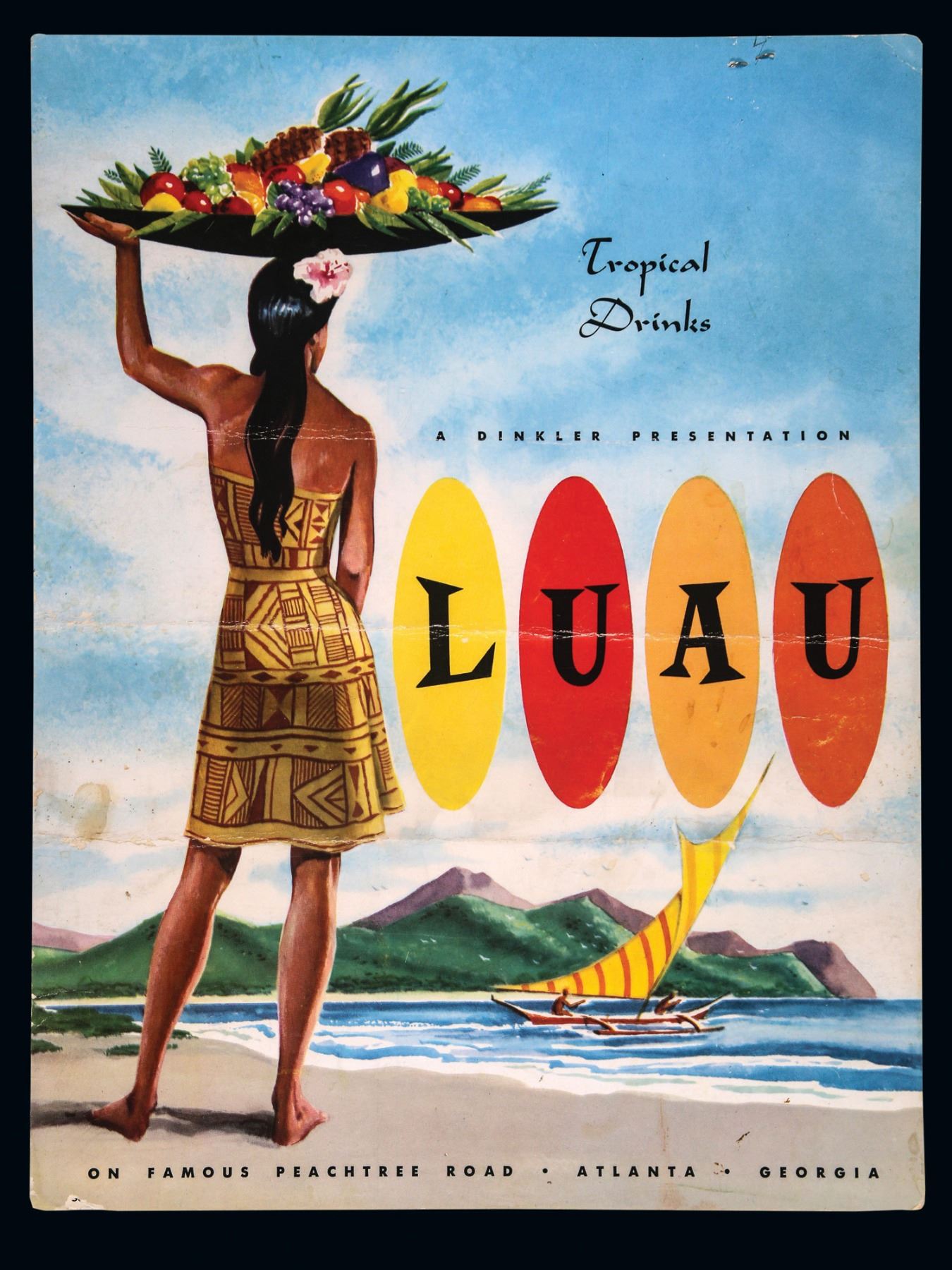 (1960s) A scarce cocktail menu from the famed LUAU restaurant in Atlanta, Georgia. VG with center fold crease. 10"x13" closed.