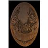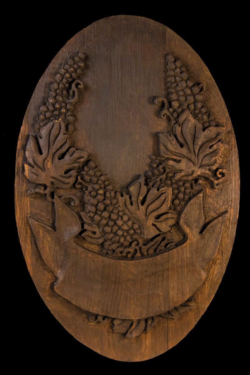 (1960s) A large, decorative wine barrel themed keg design with a blank ribbon area for customization. This is the master pattern carving.30"x20"VG+ with typical wear