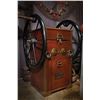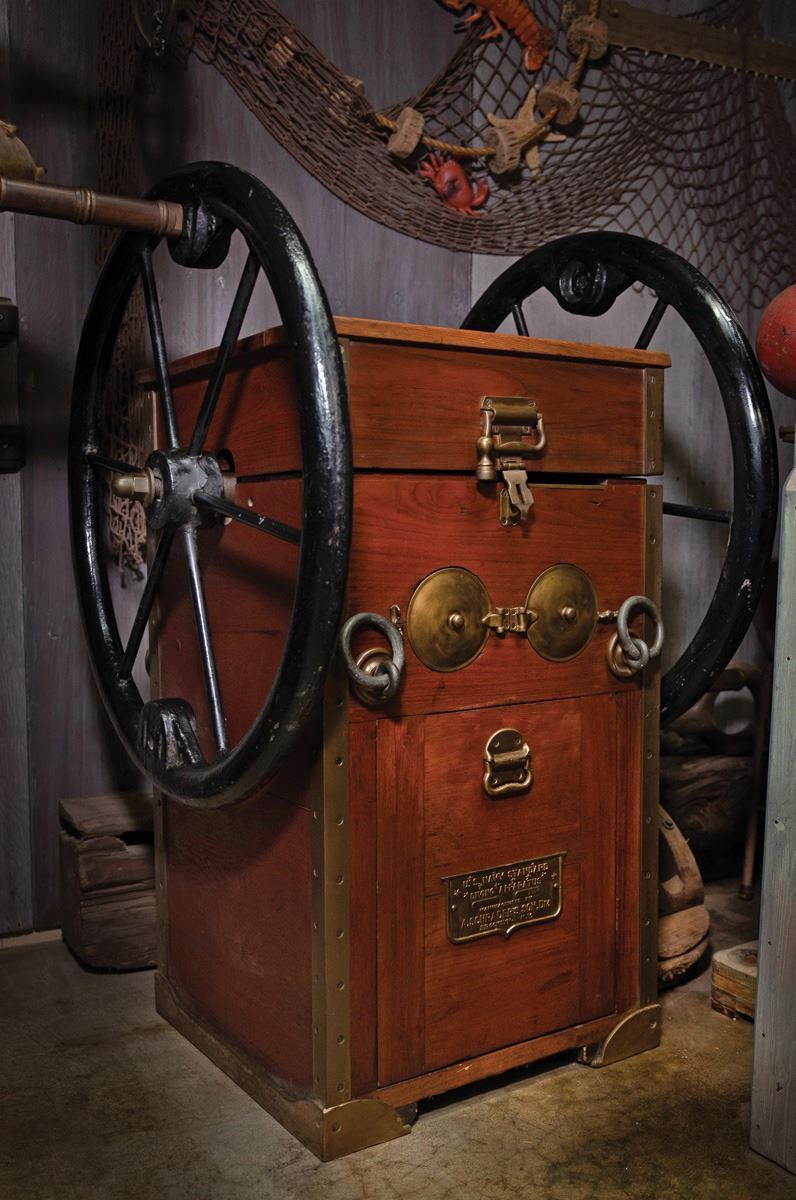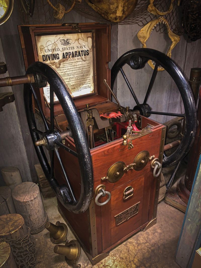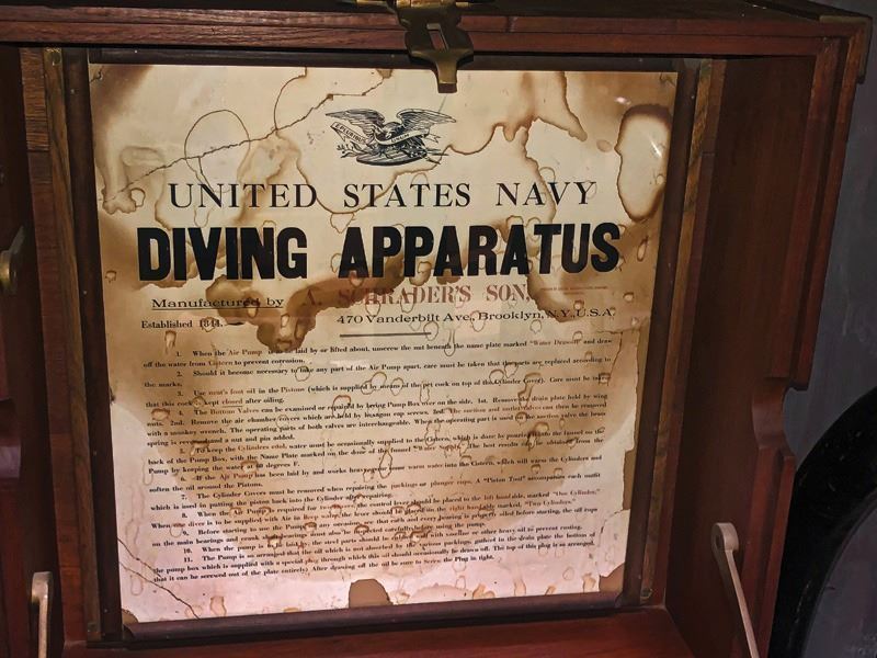 (1930s) A absolutely gorgeous, original US Navy dual-diver air pump apparatus. In its original oak case with much of its original parts and hardware. This incredible piece has been in the Oceanic Arts nautical collection for over 50 years. Schrader stamped parts, wood cylinder cranks, brass crank covers and manufacturer tags, it also retains its original instruction placard under the hood lid. The whole case is edge lined with brass guard covers..a rare feature. The pressure gauges are not present.The wood is beautiful and it appears this has seen little use over the years. The brass latches and iron carrying rings are intact. Both wood capped flywheel handles are removable and stowed away in the case. Flywheels move freely. Water cistern is intact. The lower door appears to be a very well matched replacement as there are no port holes for the air hoses. These Schrader pumps are very rare and highly coveted. This condition is almost unheard of. Specimens of this type are only seen in very high-end private collections or museums. This pump is not being sold as fully operational and diving in LA River with it is highly discouraged. The good news is A. Schrader & Son's, established in 1887, is still in business today, providing guidance and manufacturing parts to restore their old products such as pumps and diver's helmets. Very heavy and will require special freight considerations.59"x50"x31" as shown open.VG+ with typical wear from use.
