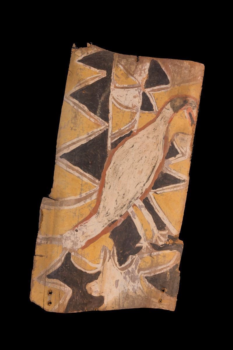 (Mid-Century) A palm spathe painting featuring a Cockatoo Bird and clan motifs in bold polychrome paint.19"x10.5".VG Various pierced holes for attachment. Areas of minor loss and age cracks and wear.