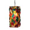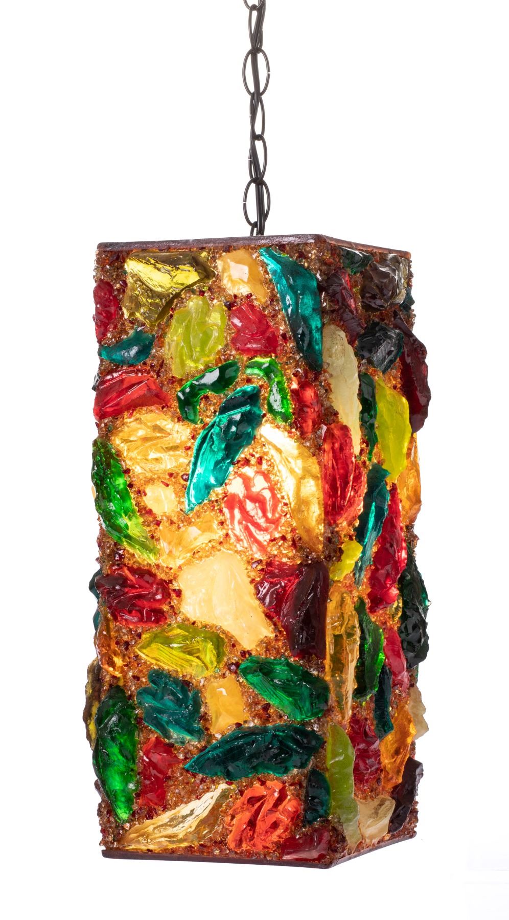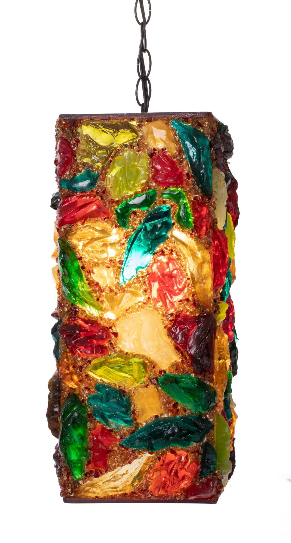 (1960s) A fantasy of color and imagination with this acrylic hanging lamp. Multi-colored large pieces of blue, yellow, red, green, and purple chunks embedded into a field of crushed amber acrylic pieces create a rainbow effect when illuminated. Original hardware shows oxidation but is intact and was kept. Lamps have been checked and where necessary sockets and/or electrical cord and hanging chain is newly replaced.18.5"x9"x9". VG+.
