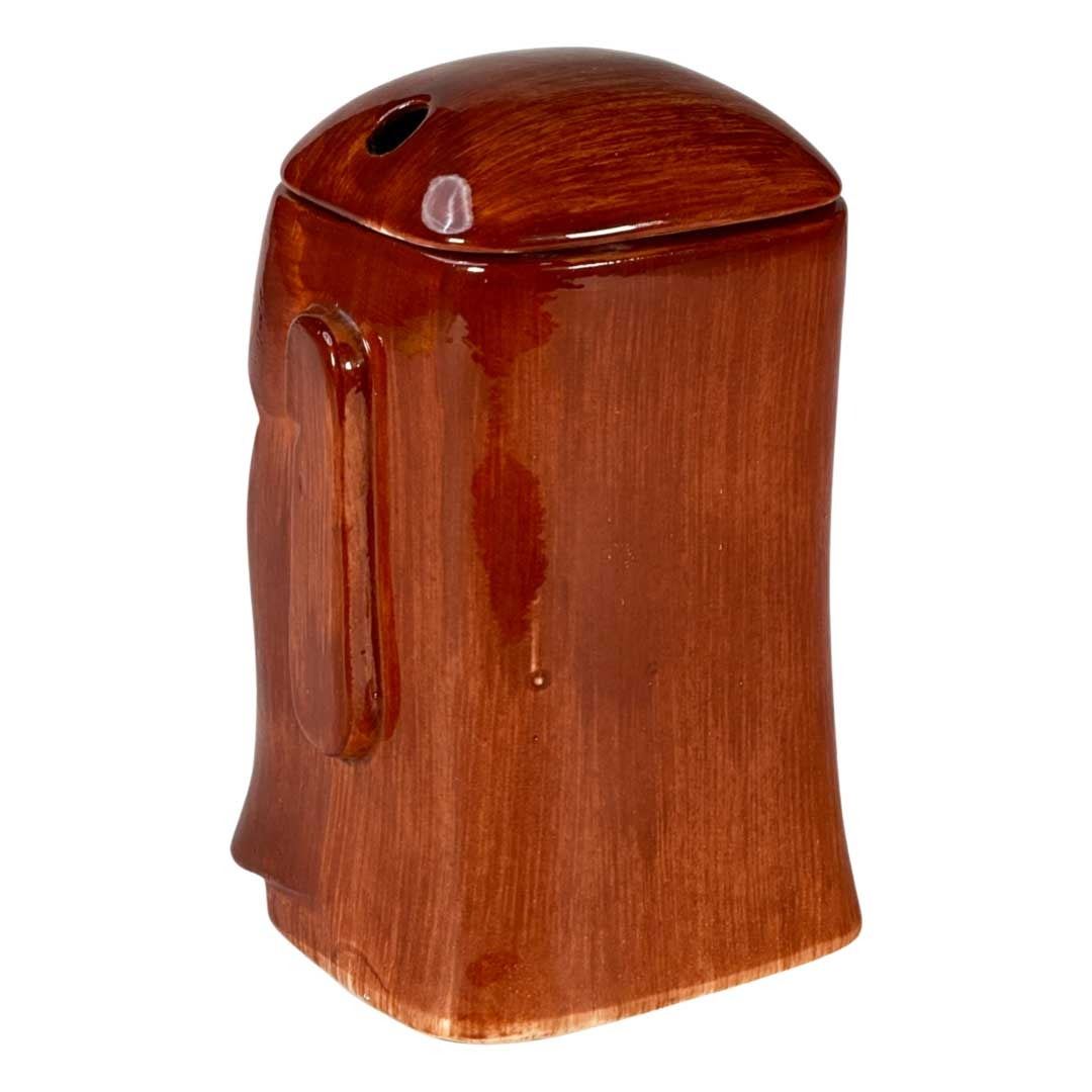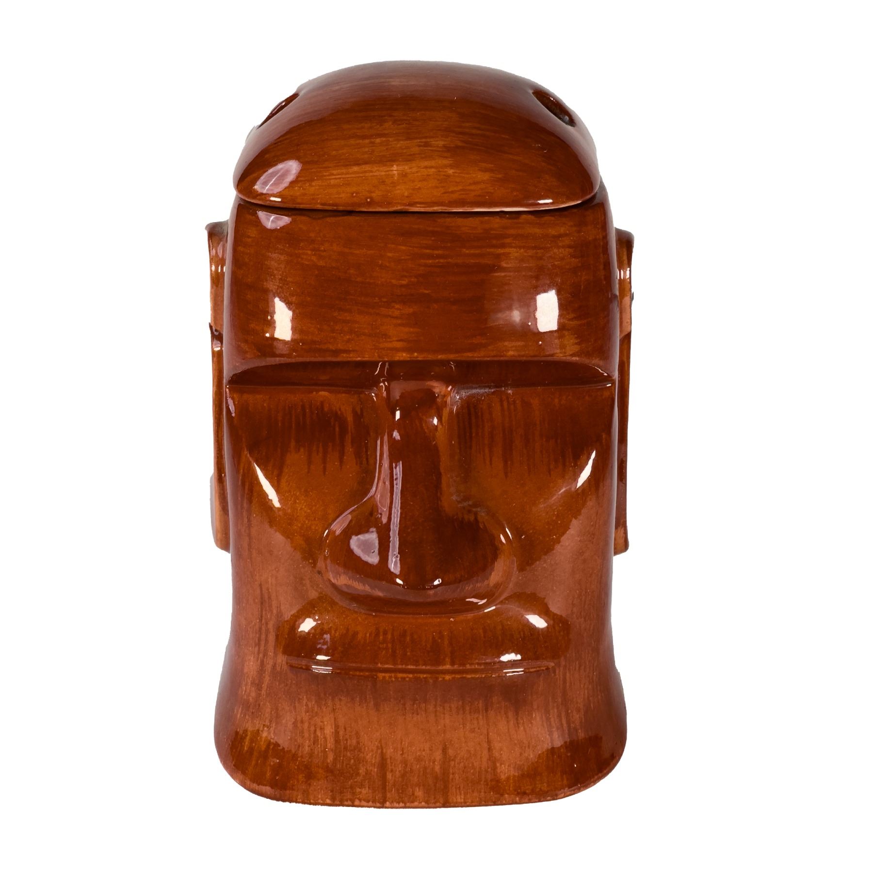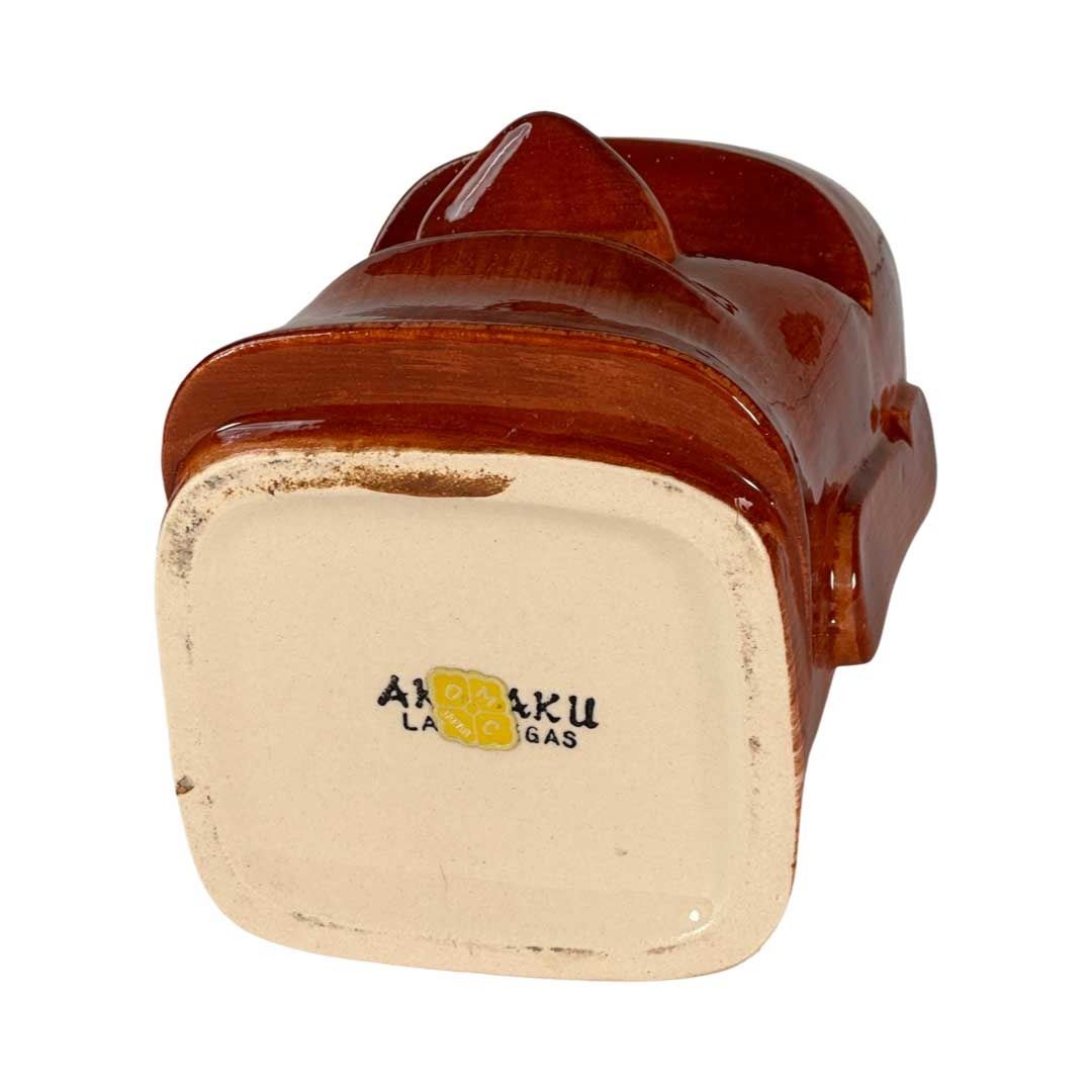 (1960s) Marked moai mug made exclusively for the Aku-Aku in Las Vegas, Nevada. Includes removable lid with straw holes. Retains OMC sticker. Mug 5.25"x4.5" w/lid 6.25"x4.5". VG+ with minor wear.