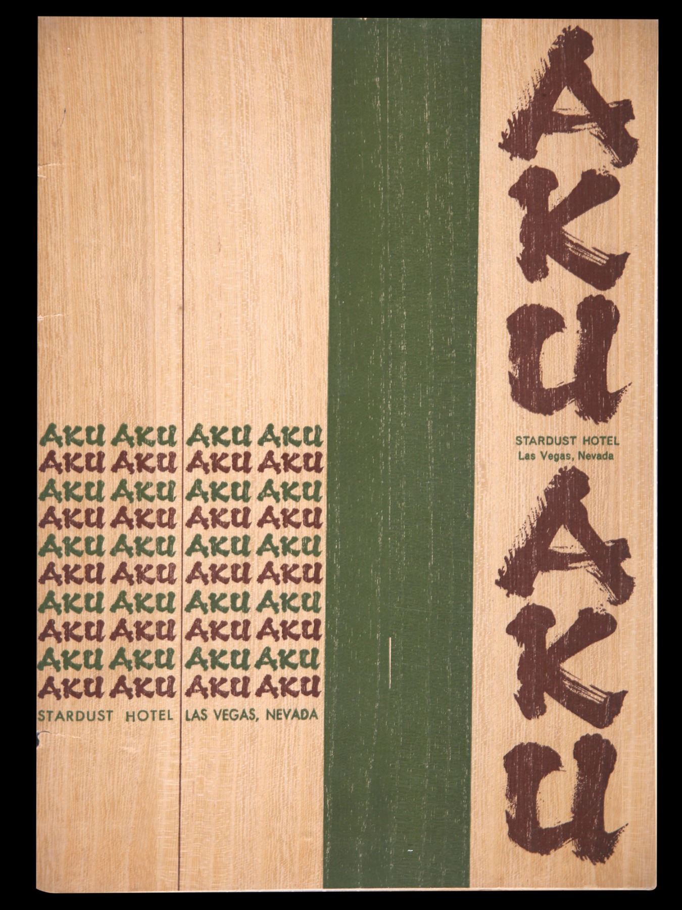 (1960s)* Full restaurant menu for the Las Vegas, NV restaurant inside the late Stardust Hotel. VG+ with light creasing and partial split in binding. 7.5"x10.5" closed.