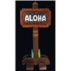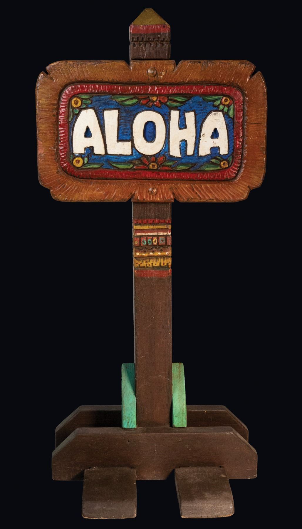 (1970s) Hand carved sign by LeRoy Schmaltz on custom floor stand. 48"x22"x22". VG+ with typical wear.