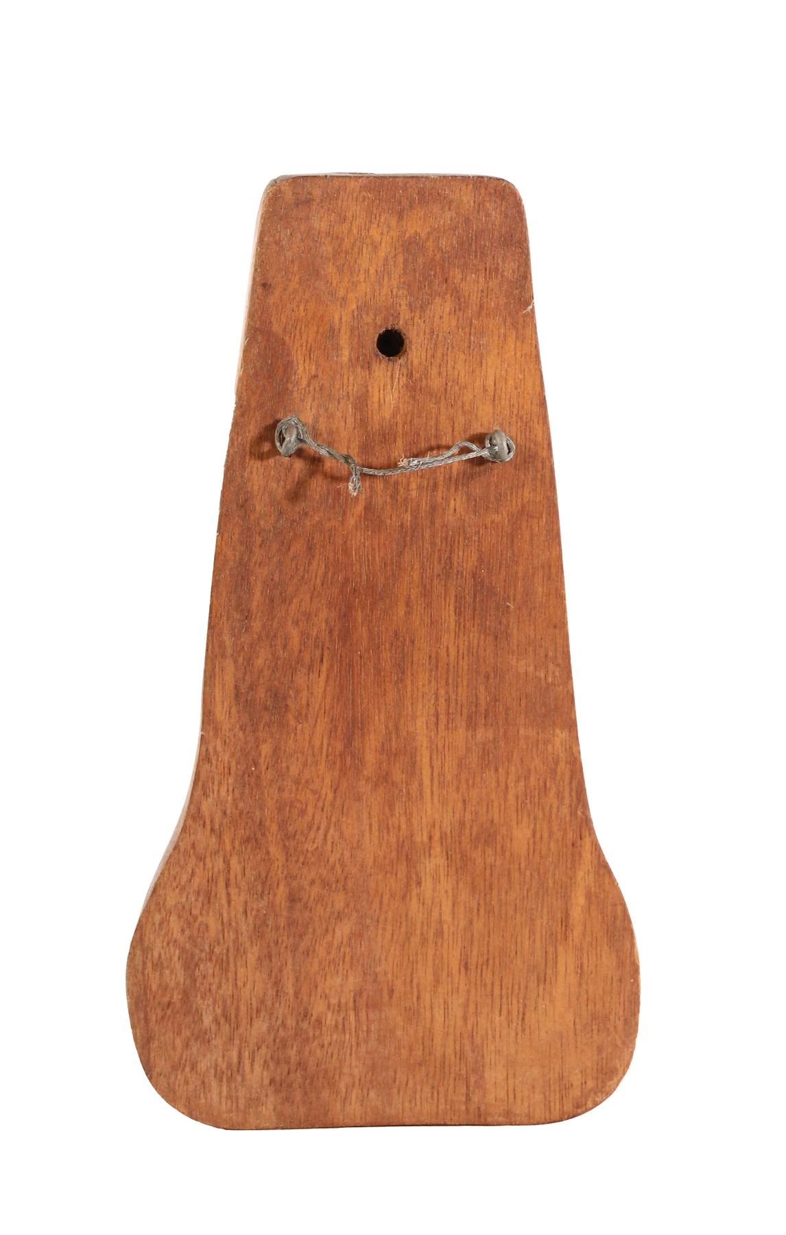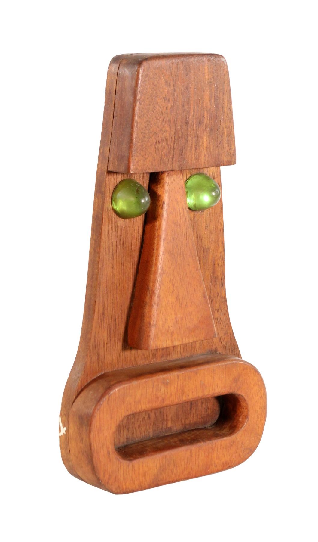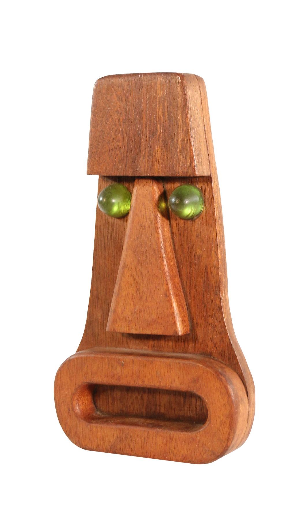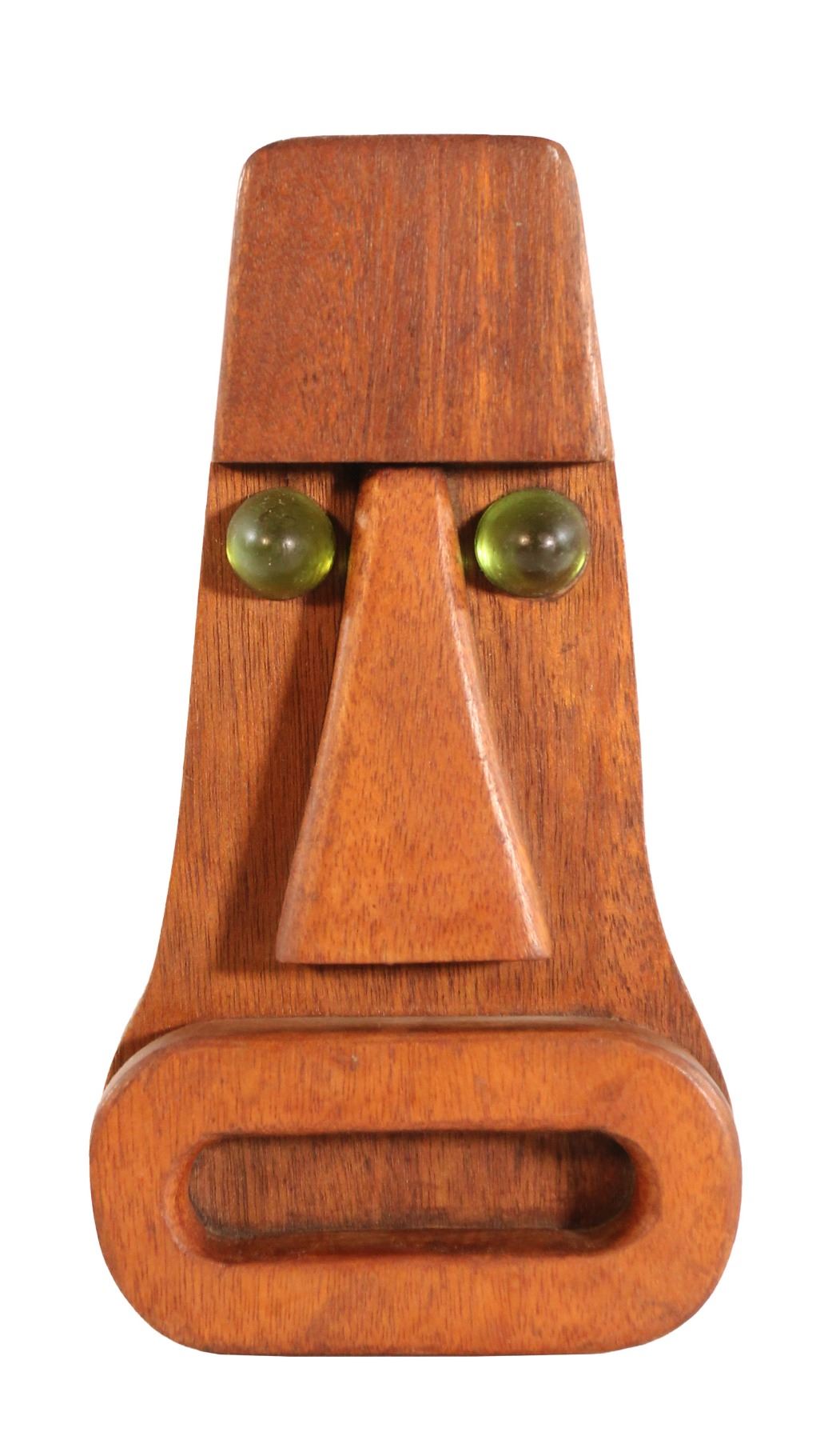 (1960s) Carved Moai-style Tiki figure with green glass eyes and open, wide mouth. Surely a riff on the classic OA #438 Polynesian Mask. 11"x6". VG white paint on lower edge of item.
