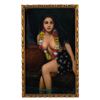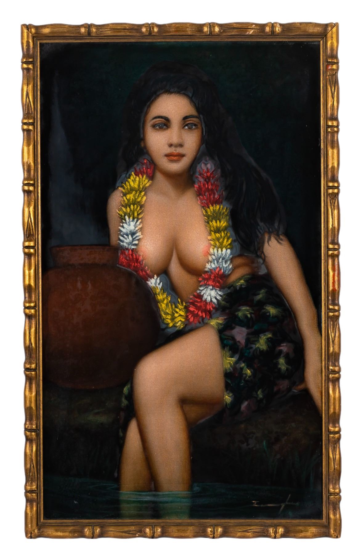 (1950s) Here is a unique original, the execution of which we have not run across before. This beautiful wahine is expertly rendered on black velvet, but also appears to have levels of paint using the added dimension of the glass. Striking at first glance, the details can only truly be appreciated upon close up inspection. An absolute essential addition to any home Tiki bar decor! Signed by an unidentified artist. In original metallic bamboo molding frame. 21"x34". VG+ with some wear and edge crack to the original frame. Displays beautifully.