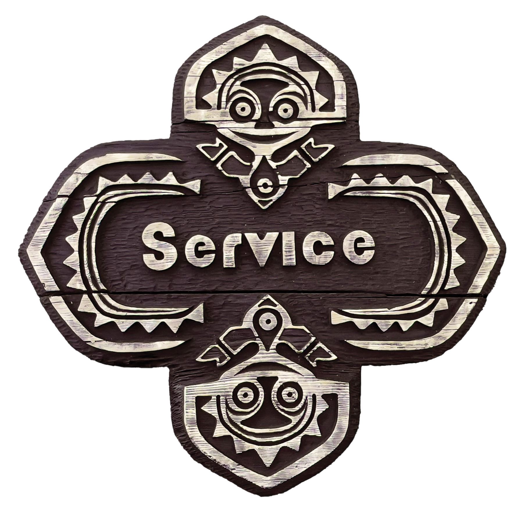 (1971) Here is one of the extremely rare original hand-carved signs in California Redwood for Walt Disney World's POLYNESIAN VILLAGE RESORT. This 36" inch sign was created in Whittier, CA at Oceanic Arts for WED Imagineering and Welton Becket & Associates. This sign is for SERVICE entrances on resort property. The wood originals lasted about ten years and by the early 1980s, Disney began casting the Redwood originals and reproducing them in fiberglass. We've never encountered one of these wood originals other than the main directional sign sold in the first OA auction. Very rare. 36"x36". VG+ with typical wear and some wood loss.