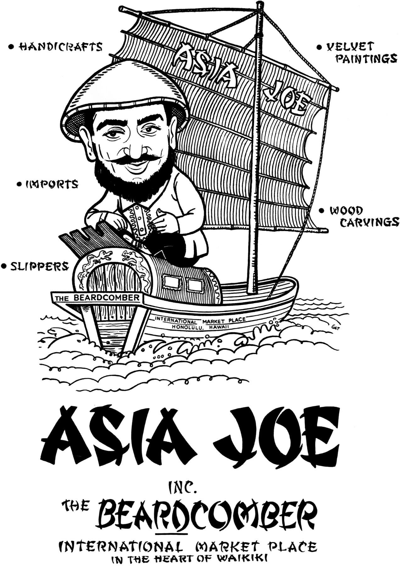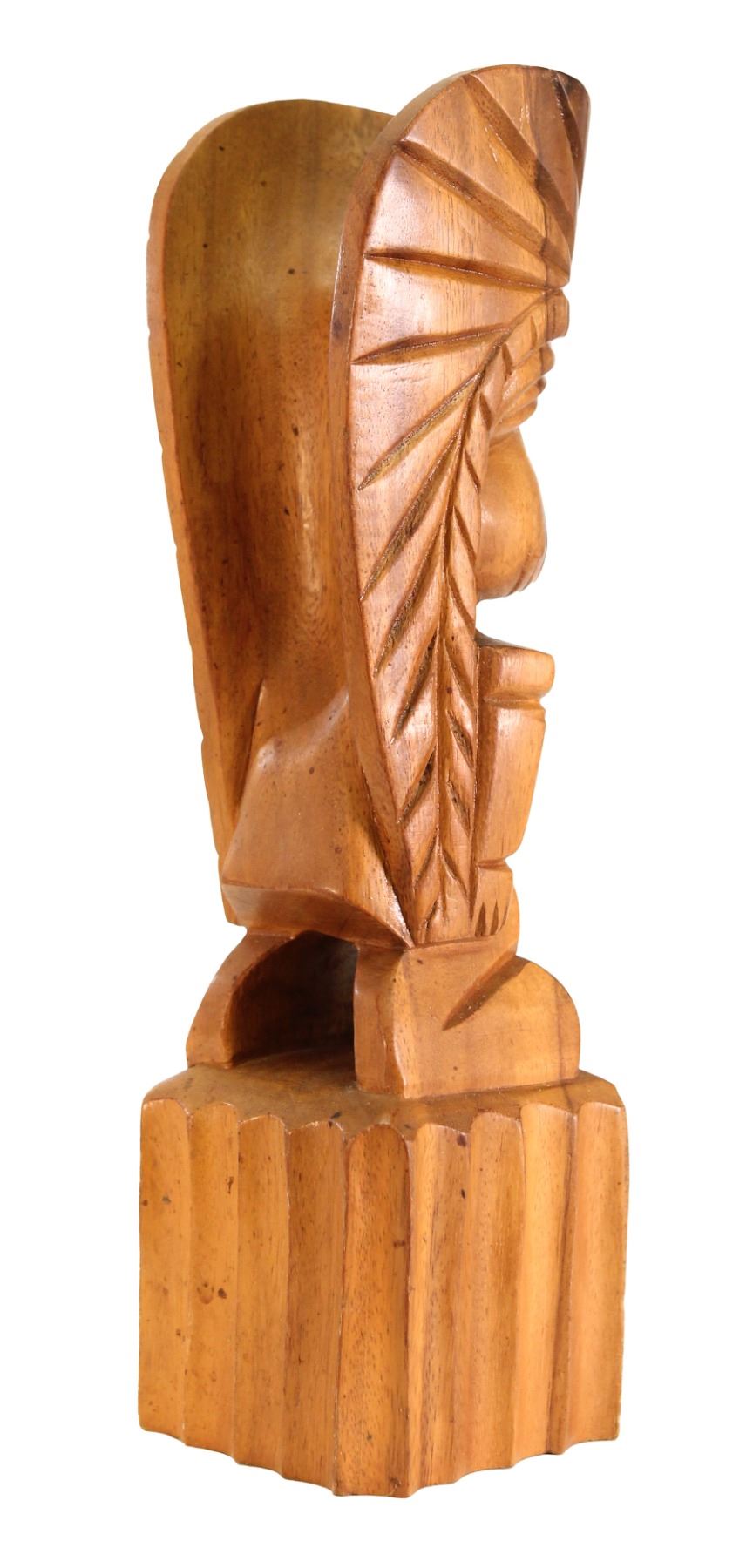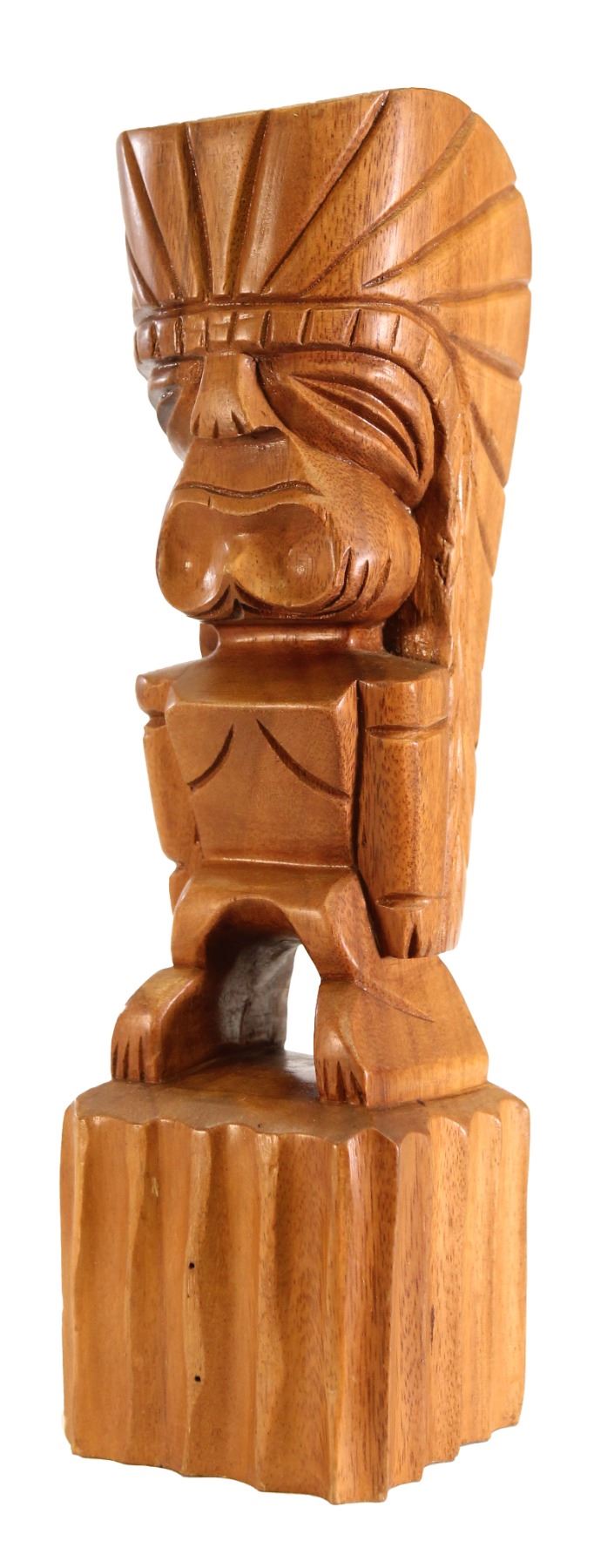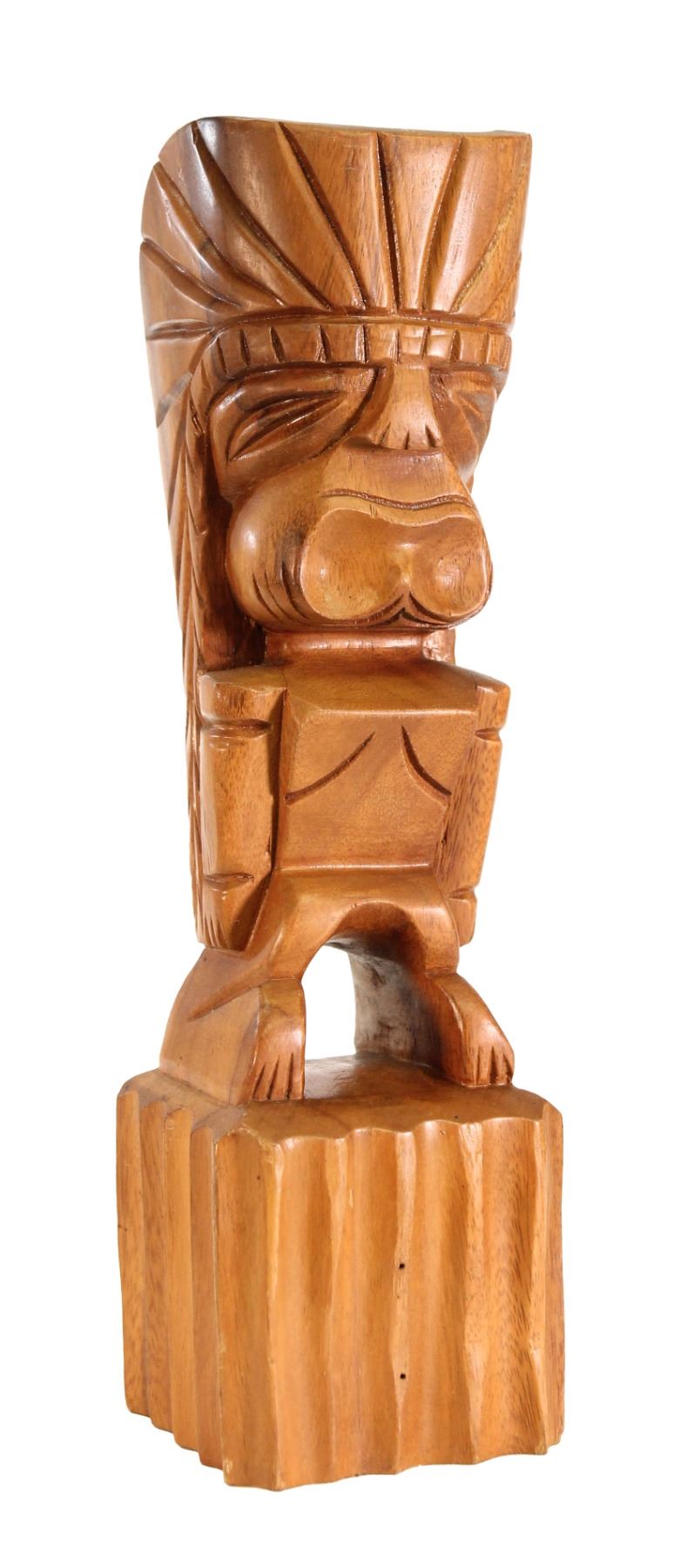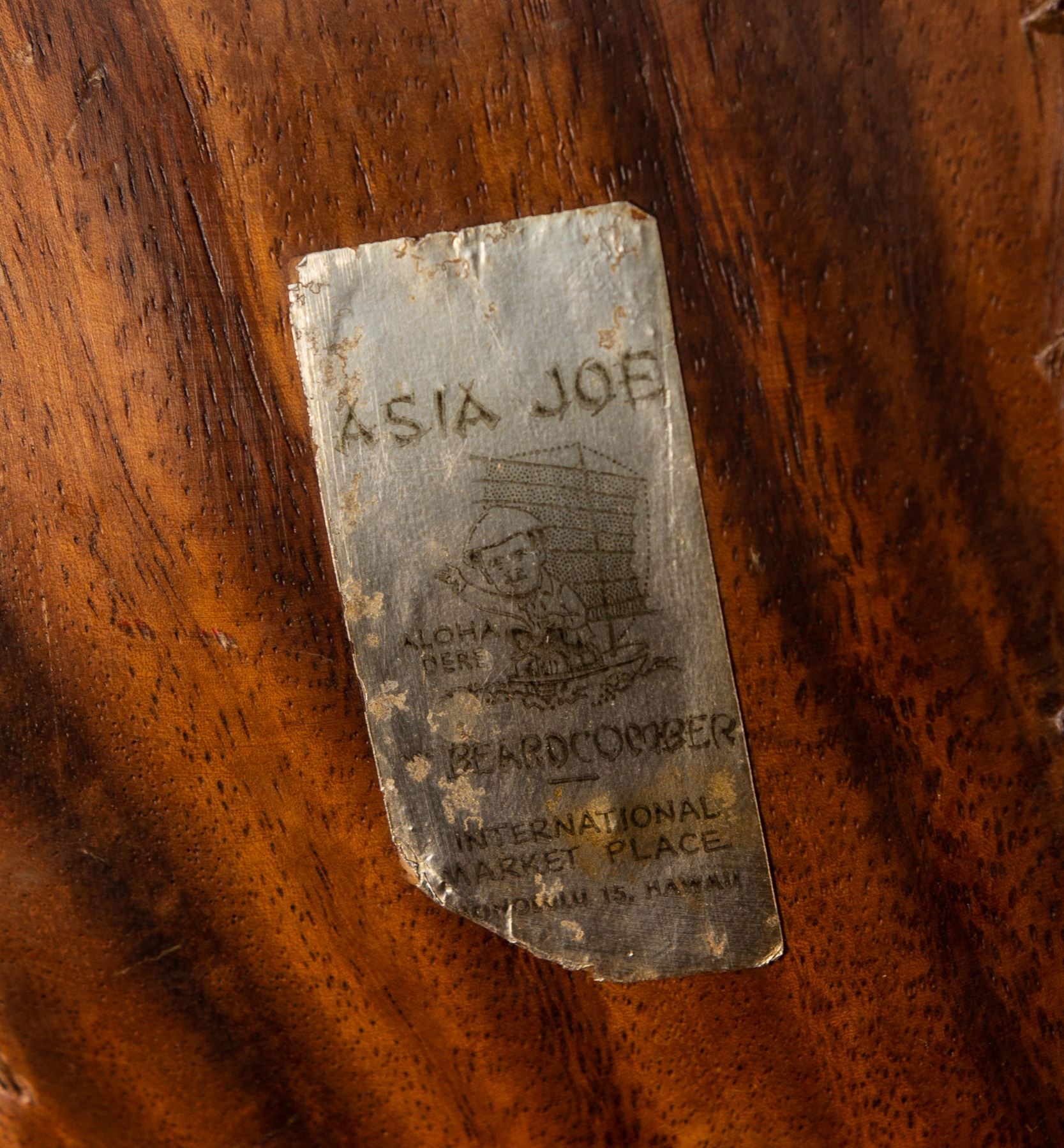 (1960s) Hawaiian War God Tiki idol imported by "Asia Joe", a colorful proprietor at THE INTERNATIONAL MARKET PLACE in Waikiki.Solid wood figure on square wood base. 14"x6"x5". VG+ with typical wear.