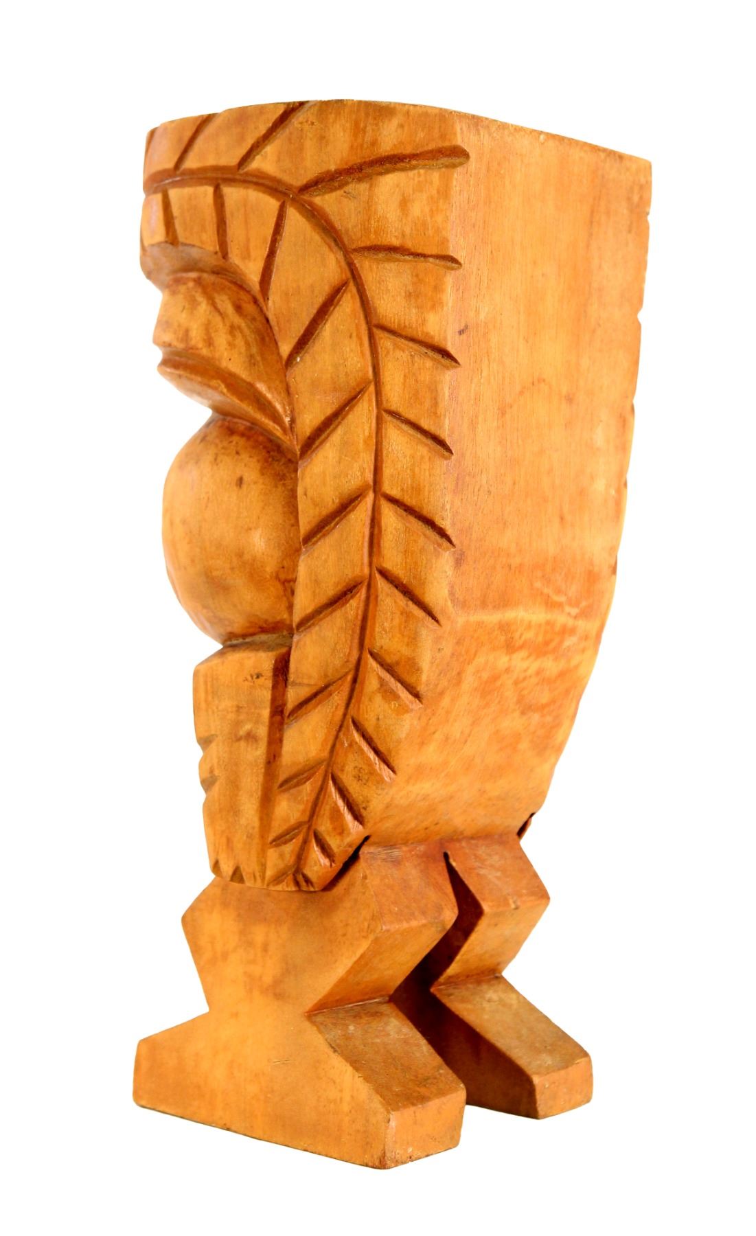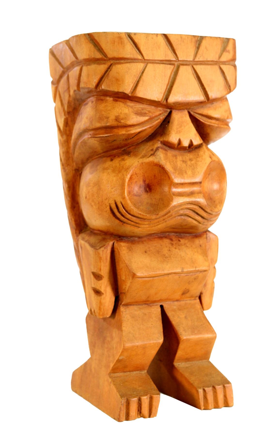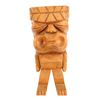 (1960s) Wood carved Tiki figure features wide, open mouth with circular end along with bug-like sleepy eyes. Free standing, fun item. 16"x6.5"x5.75". VG minor wear on wood.