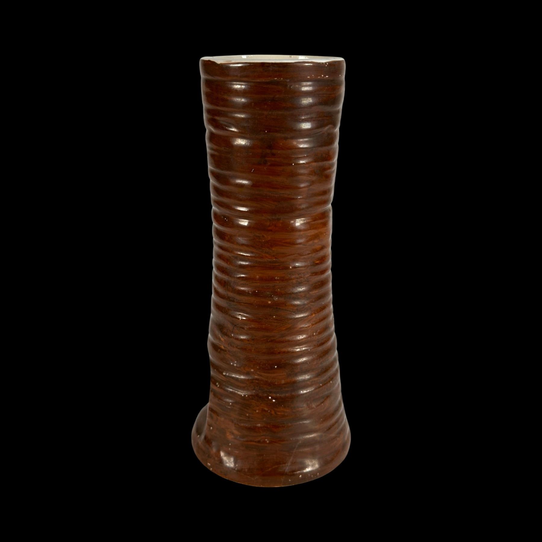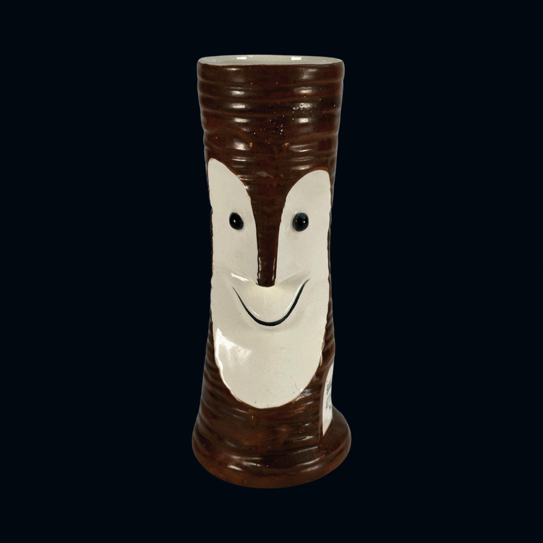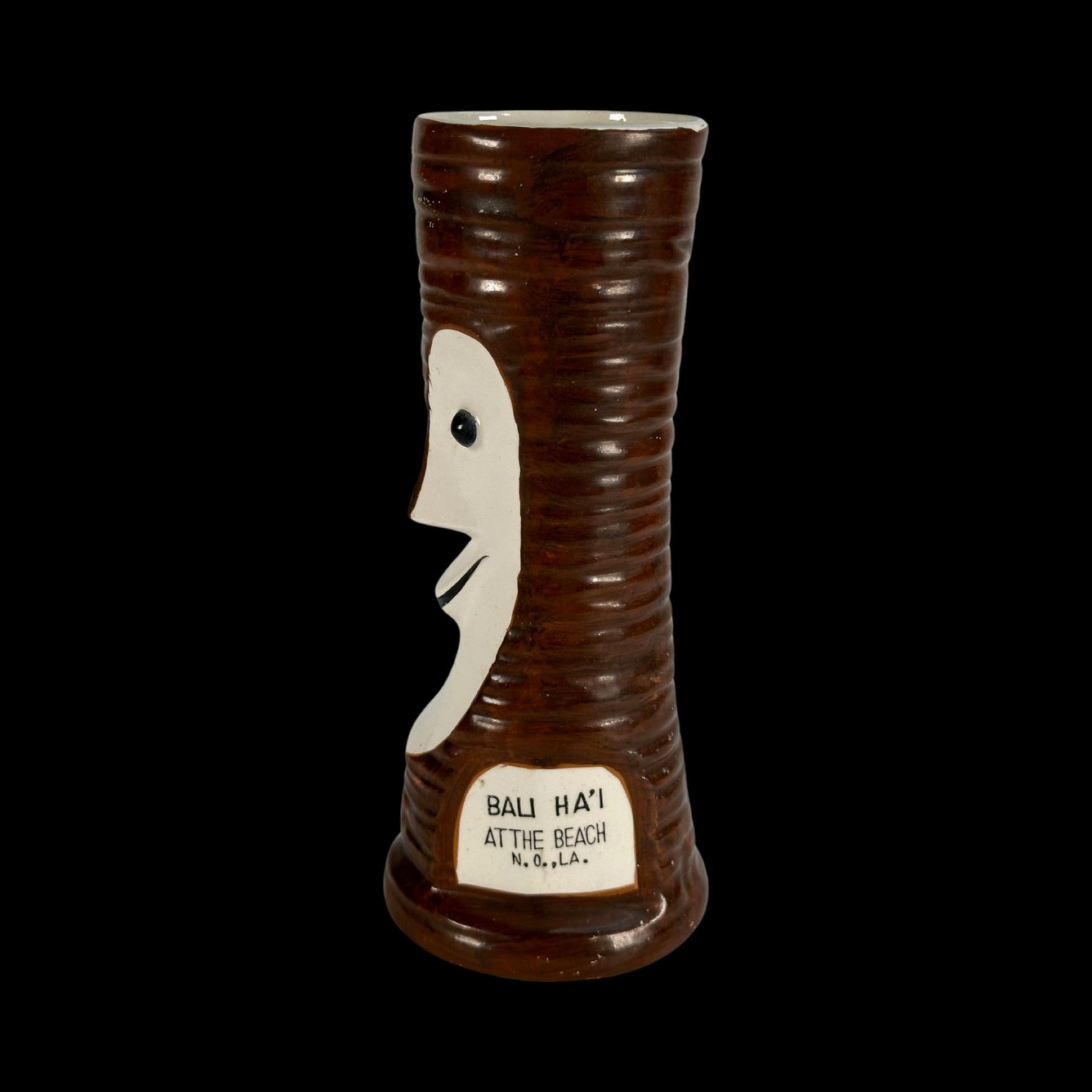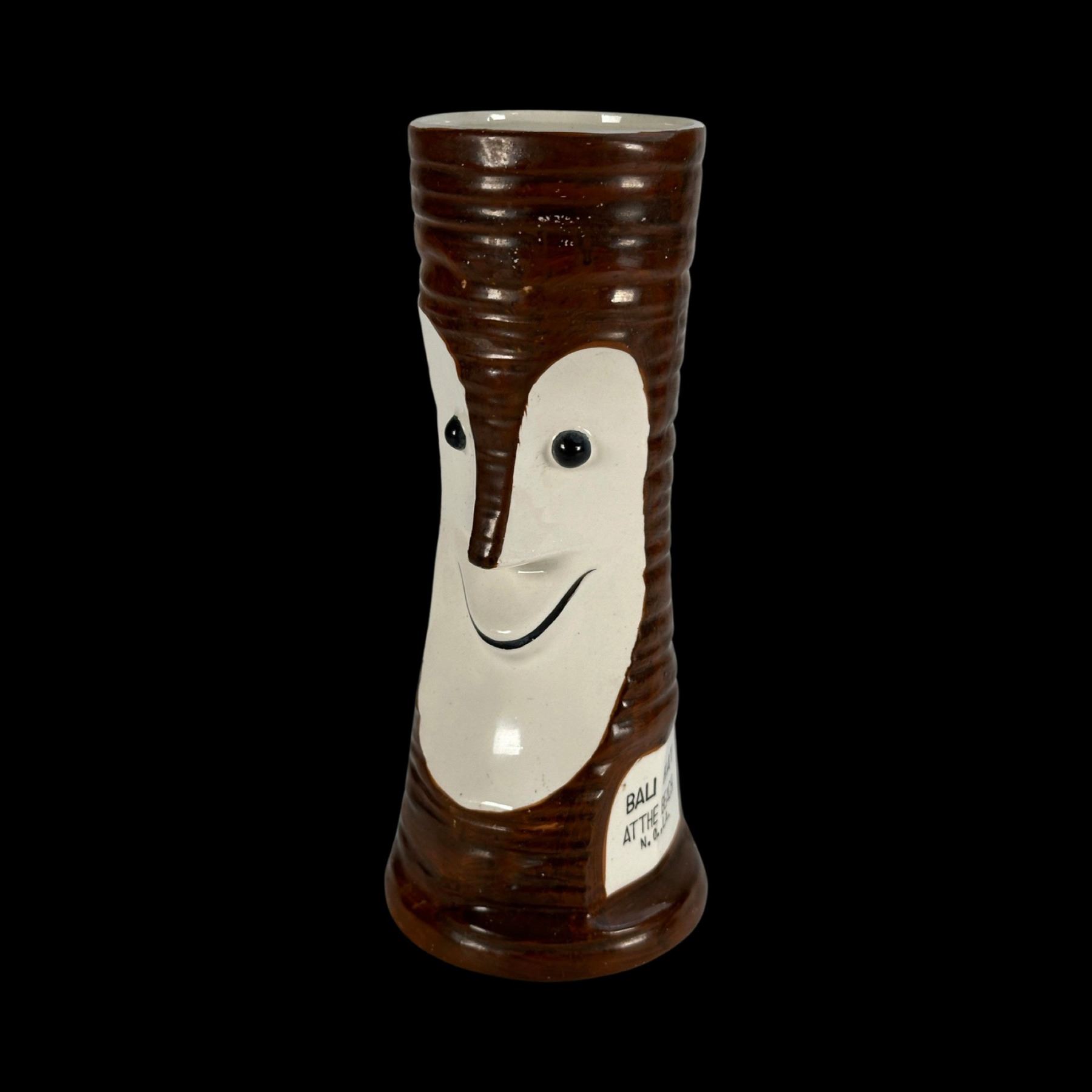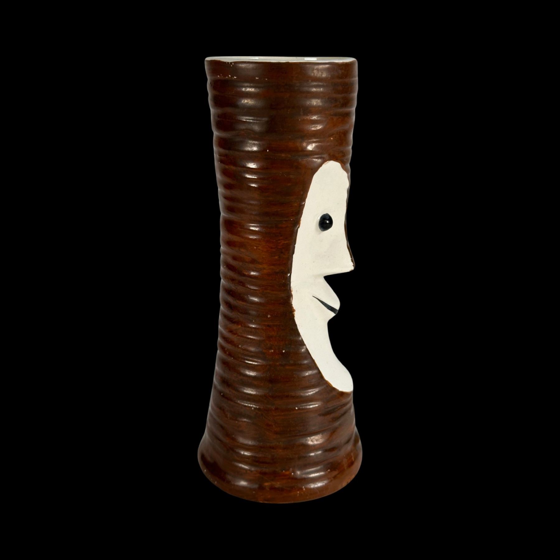 (1950s)* Museum piece displayed at the Catalina Museum Tall Tiki Tales exhibition. VG with hairline stress cracks across the underside base of the mug. 3.75"dia x 8.5".