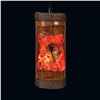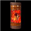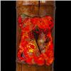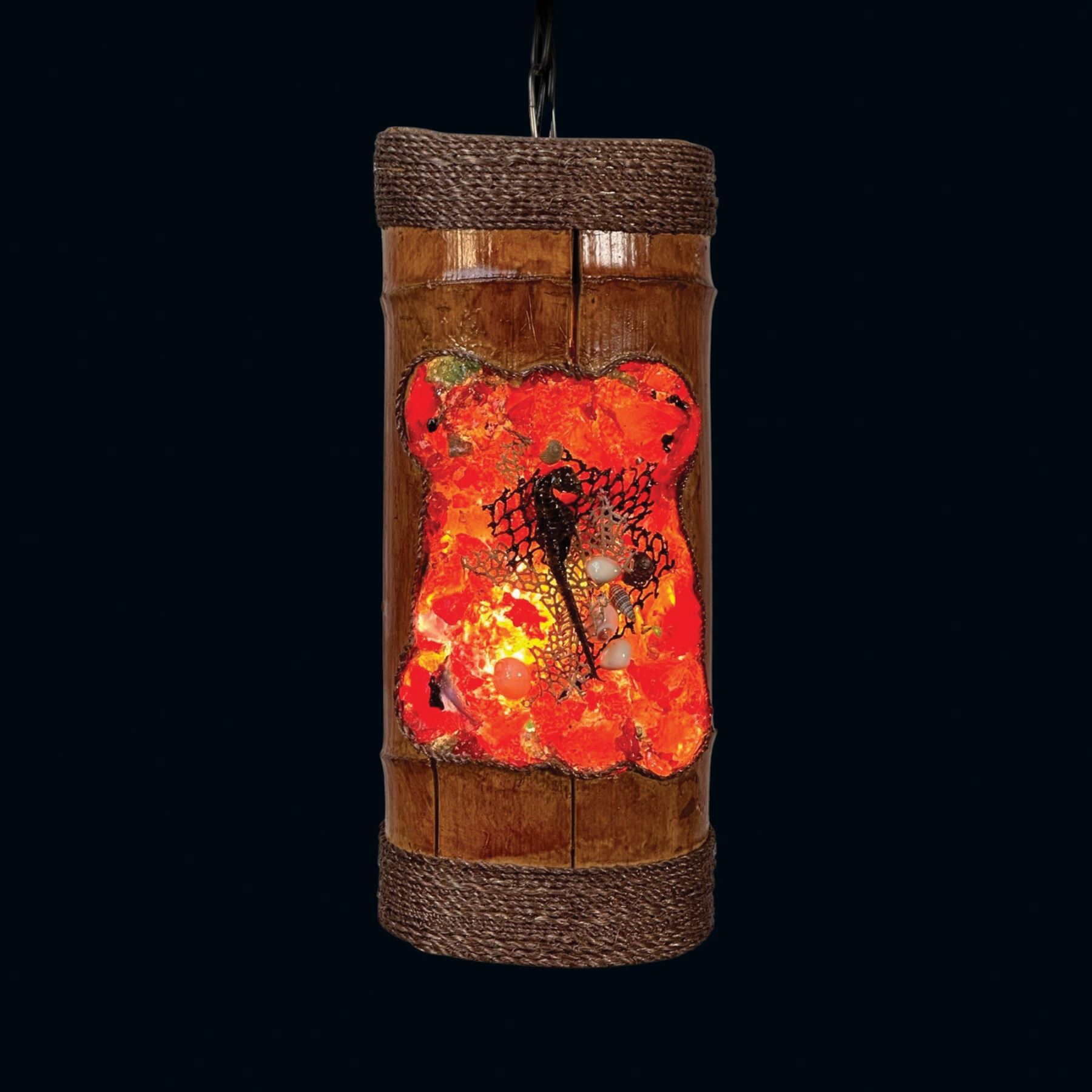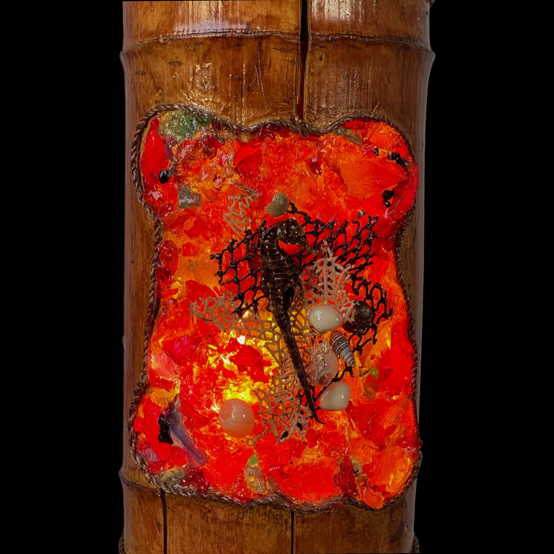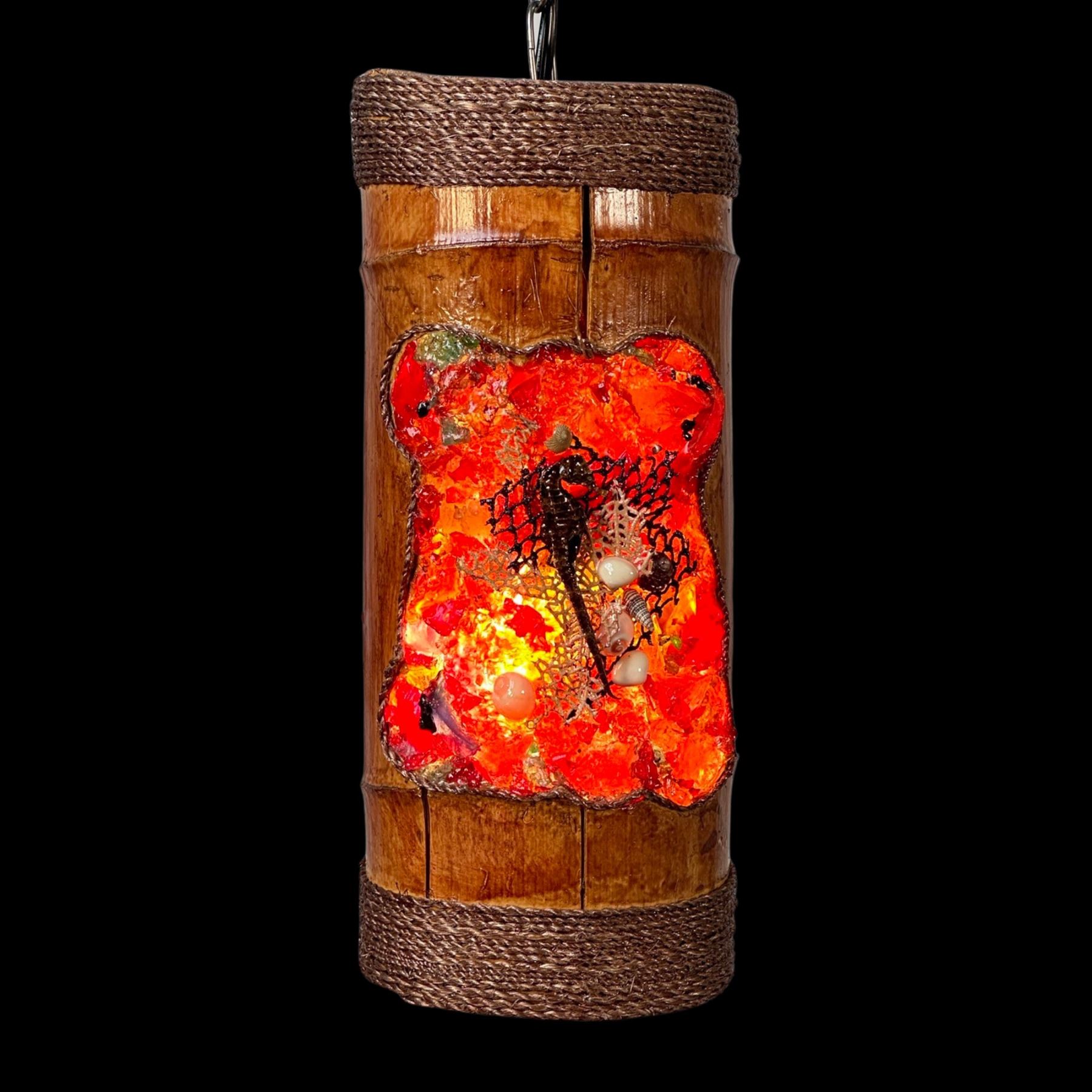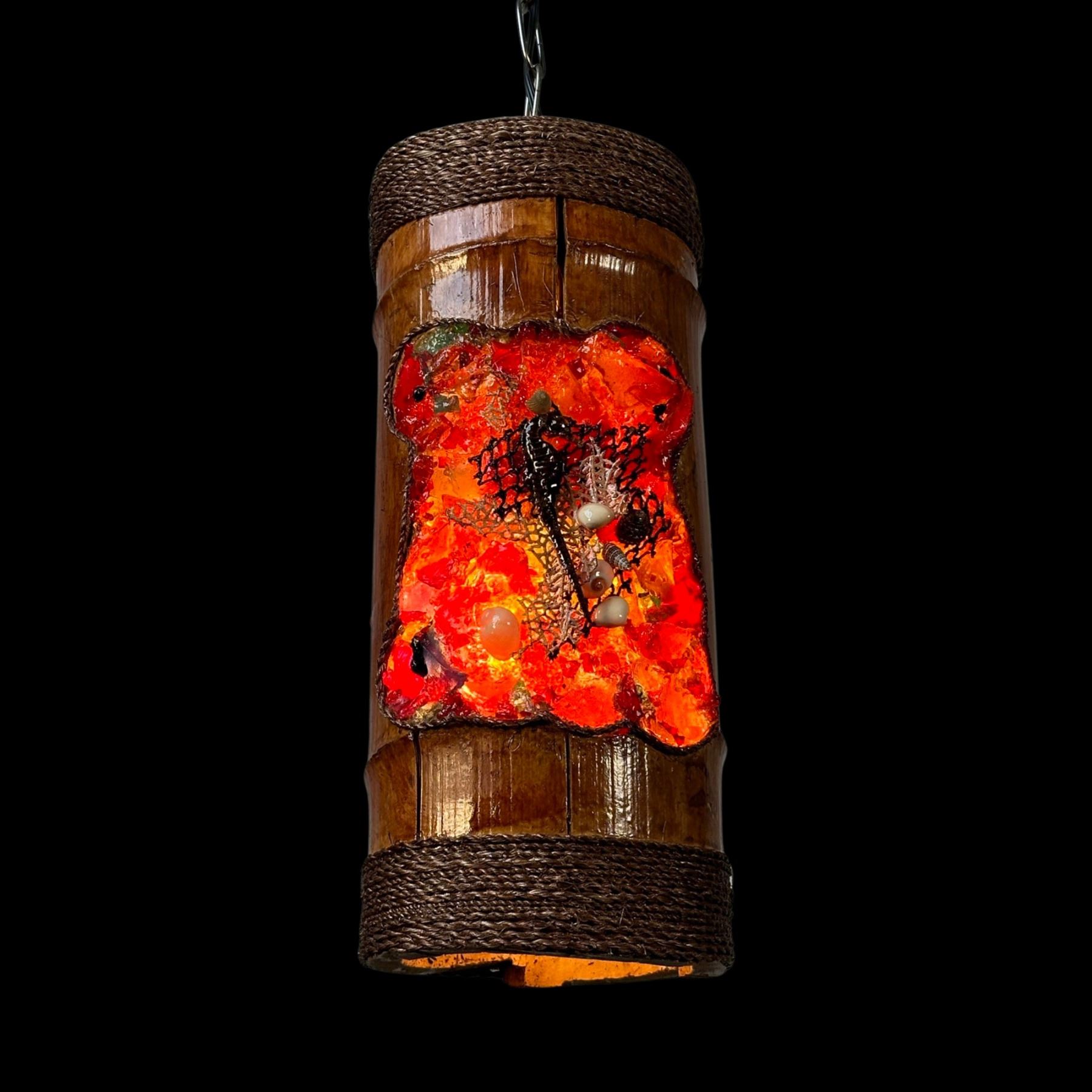 (2023) A wild take on the Tiki mask hanging lamp with this resin and coral mask impression into a hollowed bamboo drum. Produced by Kiara Geller. Lovely coral piece and seahorse infused into the red and orange resin pieces. Top and bottom with tight wrap of twine rope. Wired with cord and chain included. VG+. 5.5"dia x 13".