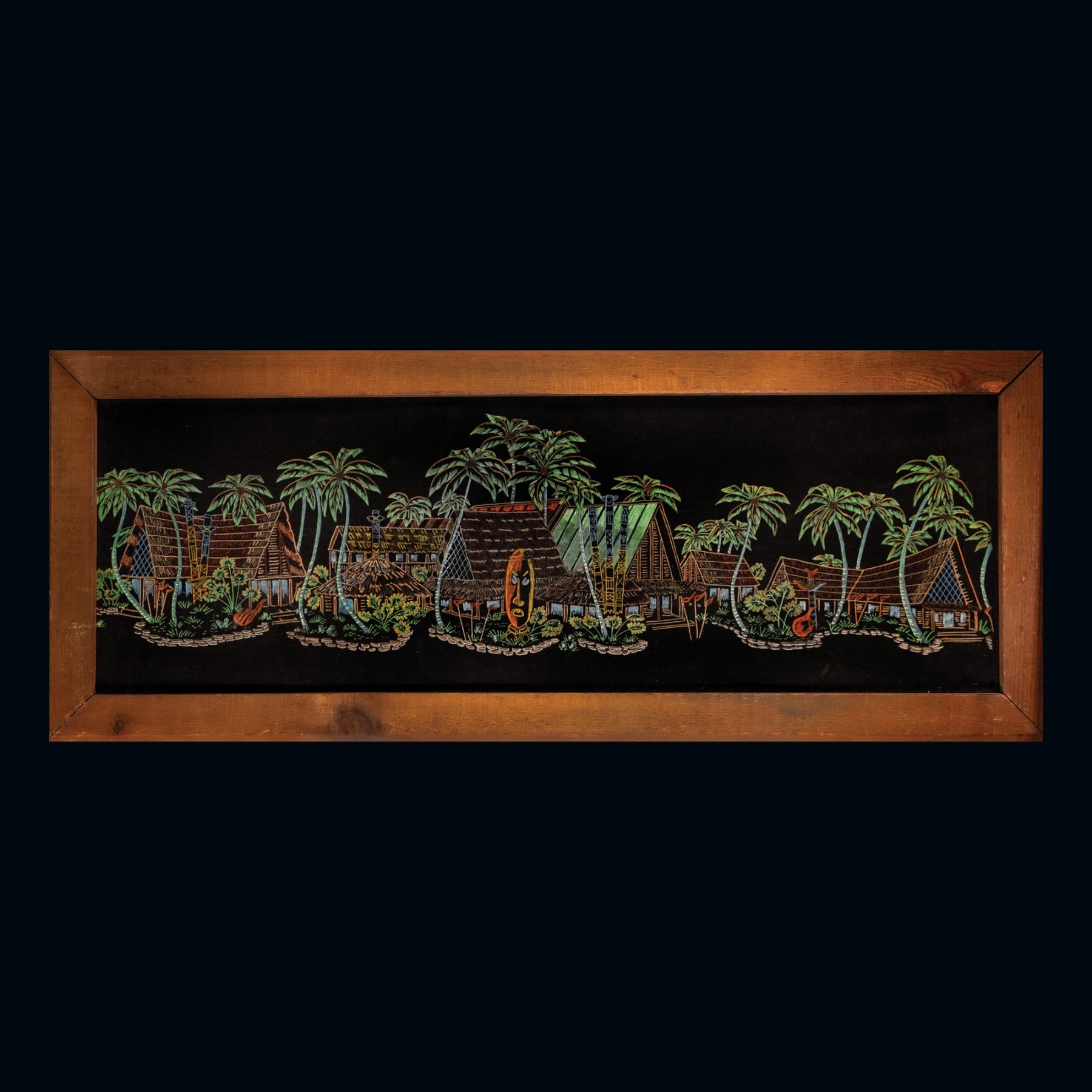 (1950s) These lovely black velvet renderings of the MAI-KAI property were based on the fanciful design of Al Kocab. These were produced both as a kit and in pre-rendered paintings sold in the famous MAI-KAI gift shop. VG+ with minor wear and small chipping to the period wood frame. 47"x19".