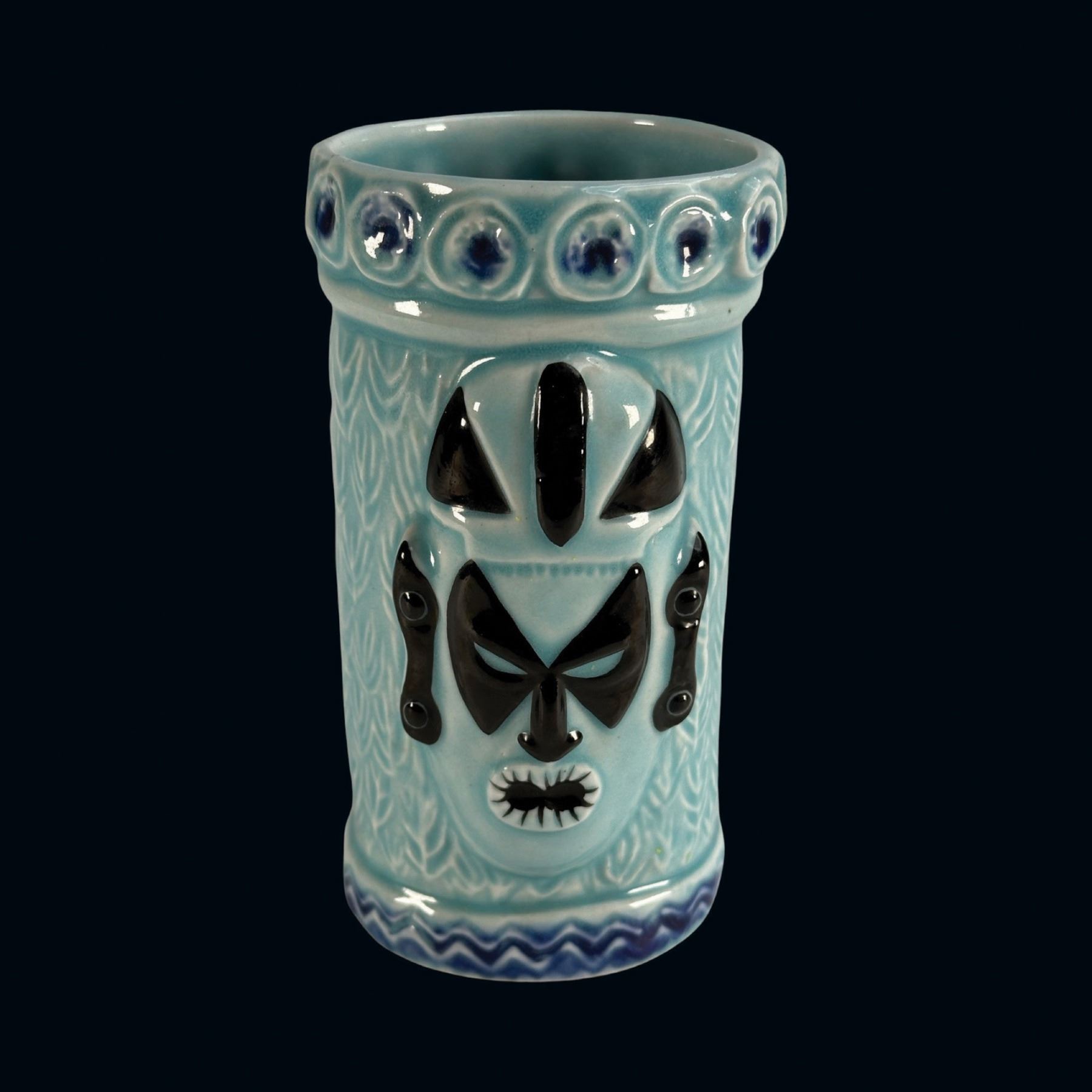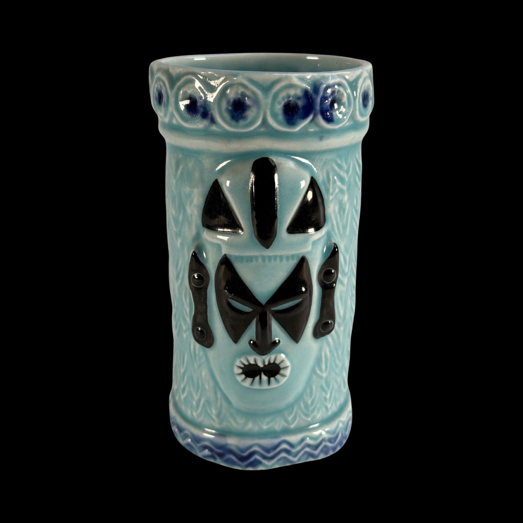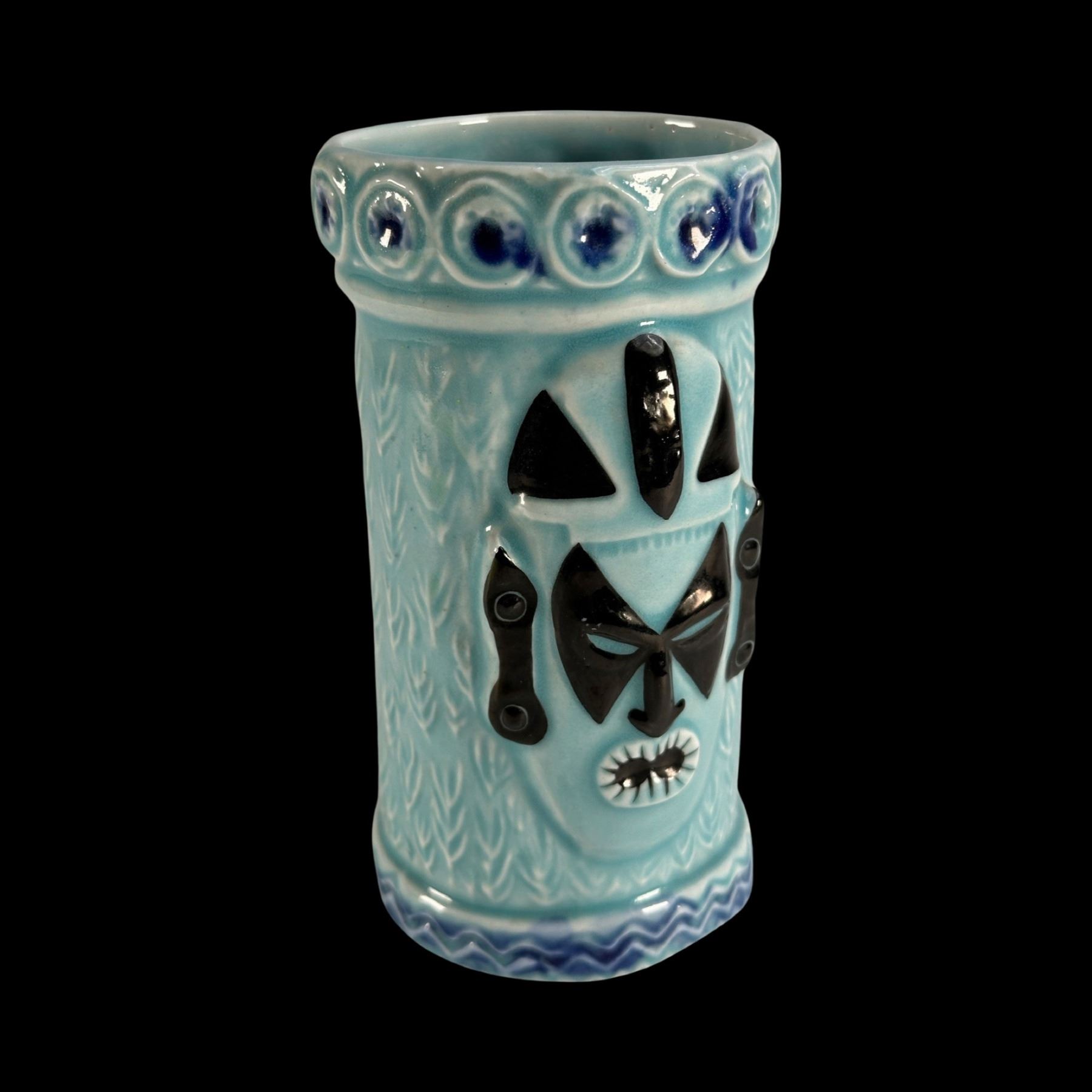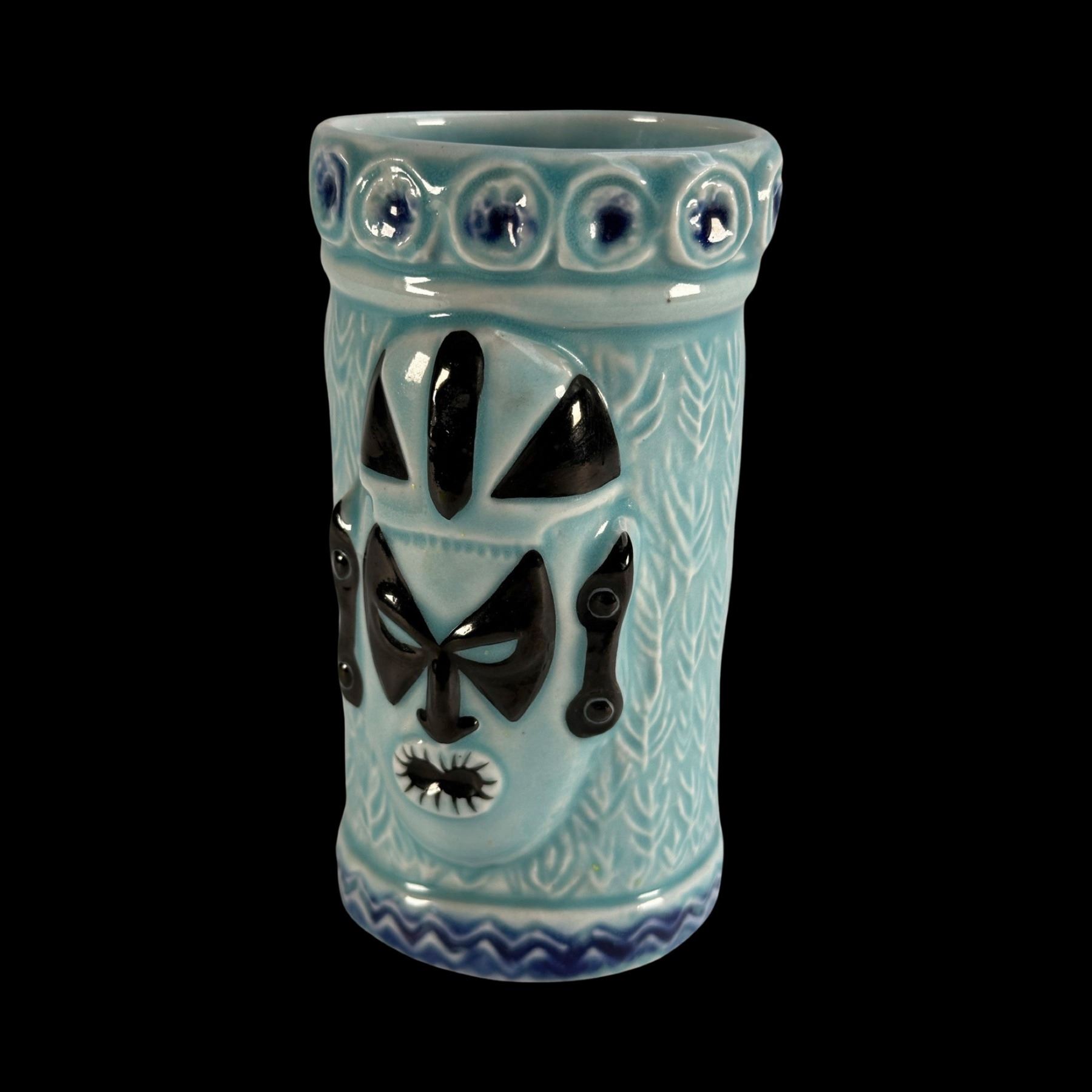 BLUE & BLACK 2-MASKED TIKI MUG w/ ROLL OF 14 "VIVA TIKI" STICKERS.