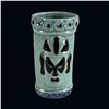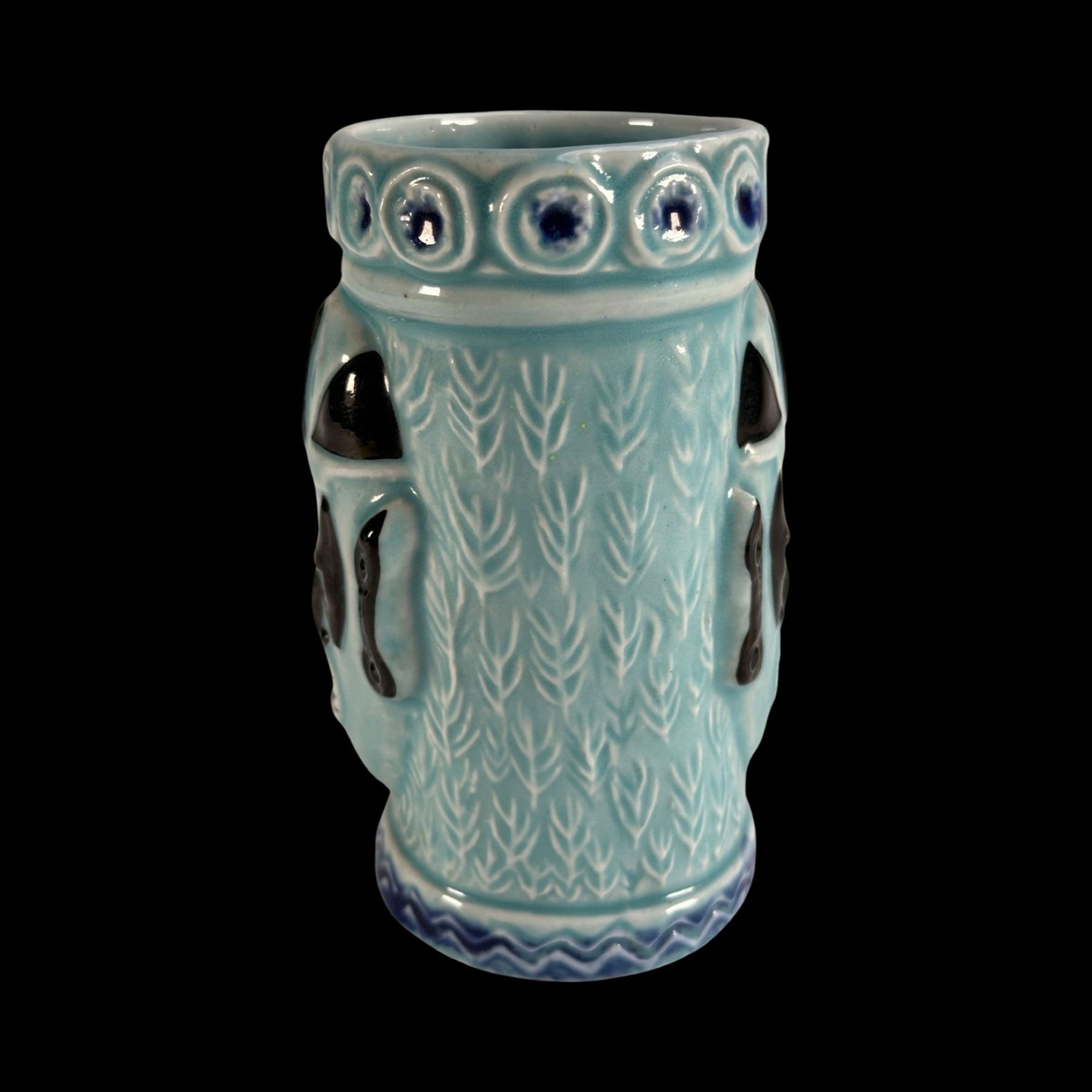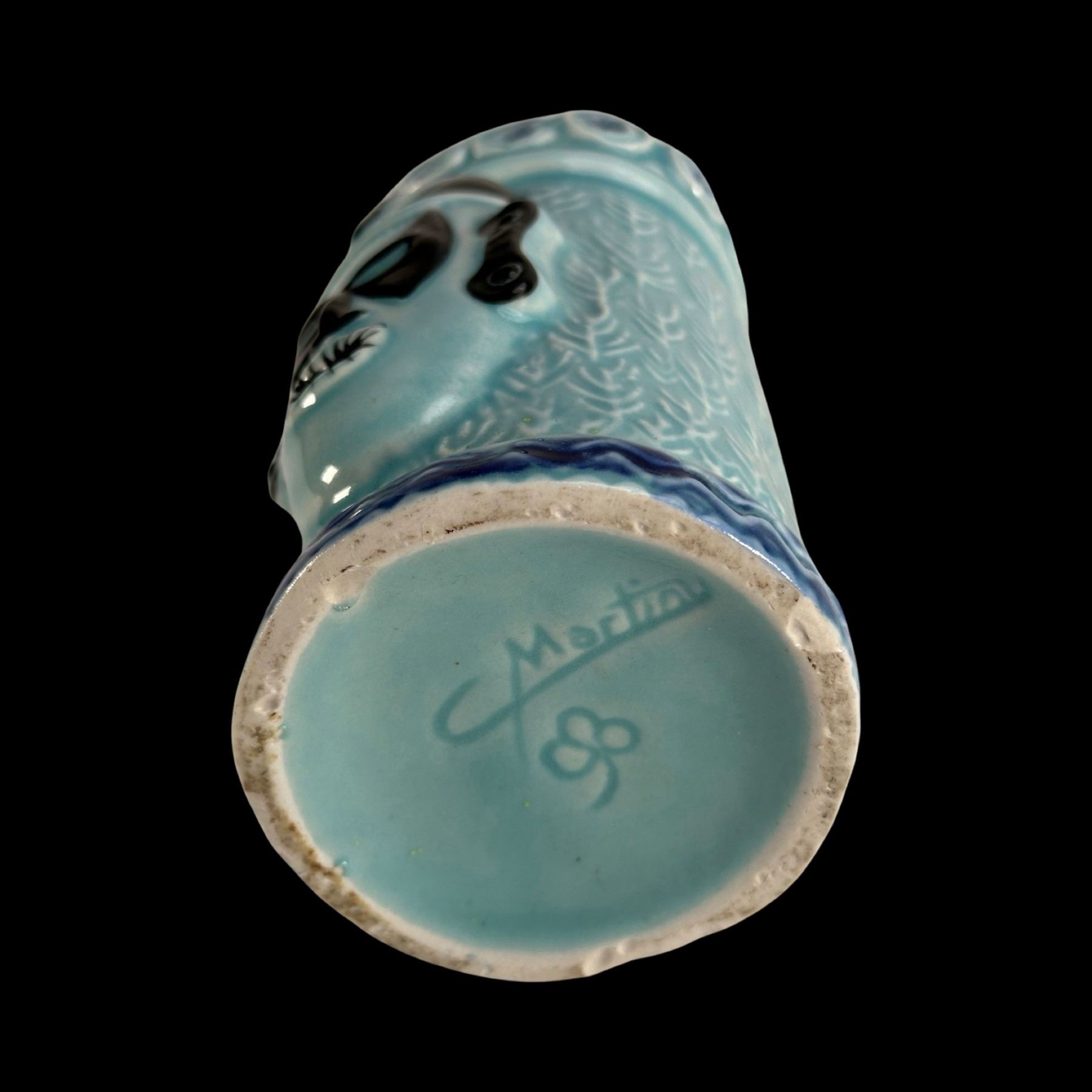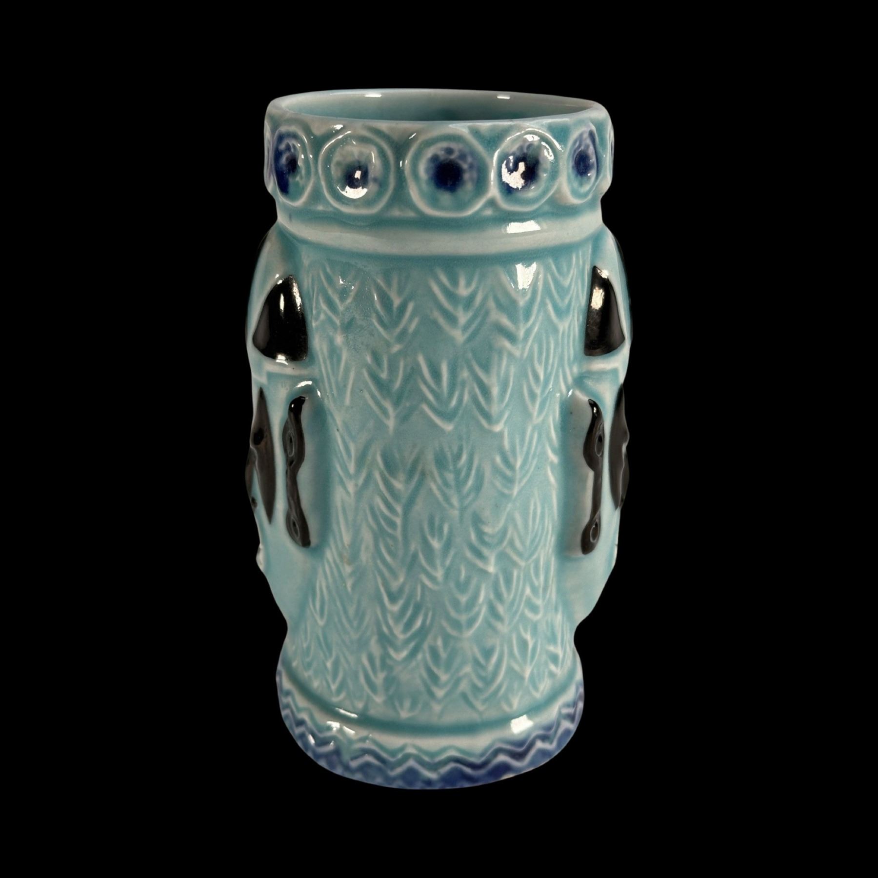 BLUE & BLACK 2-MASKED TIKI MUG w/ ROLL OF 14 "VIVA TIKI" STICKERS.