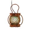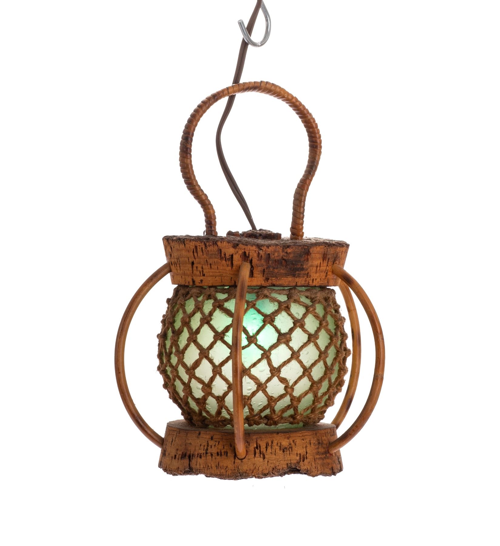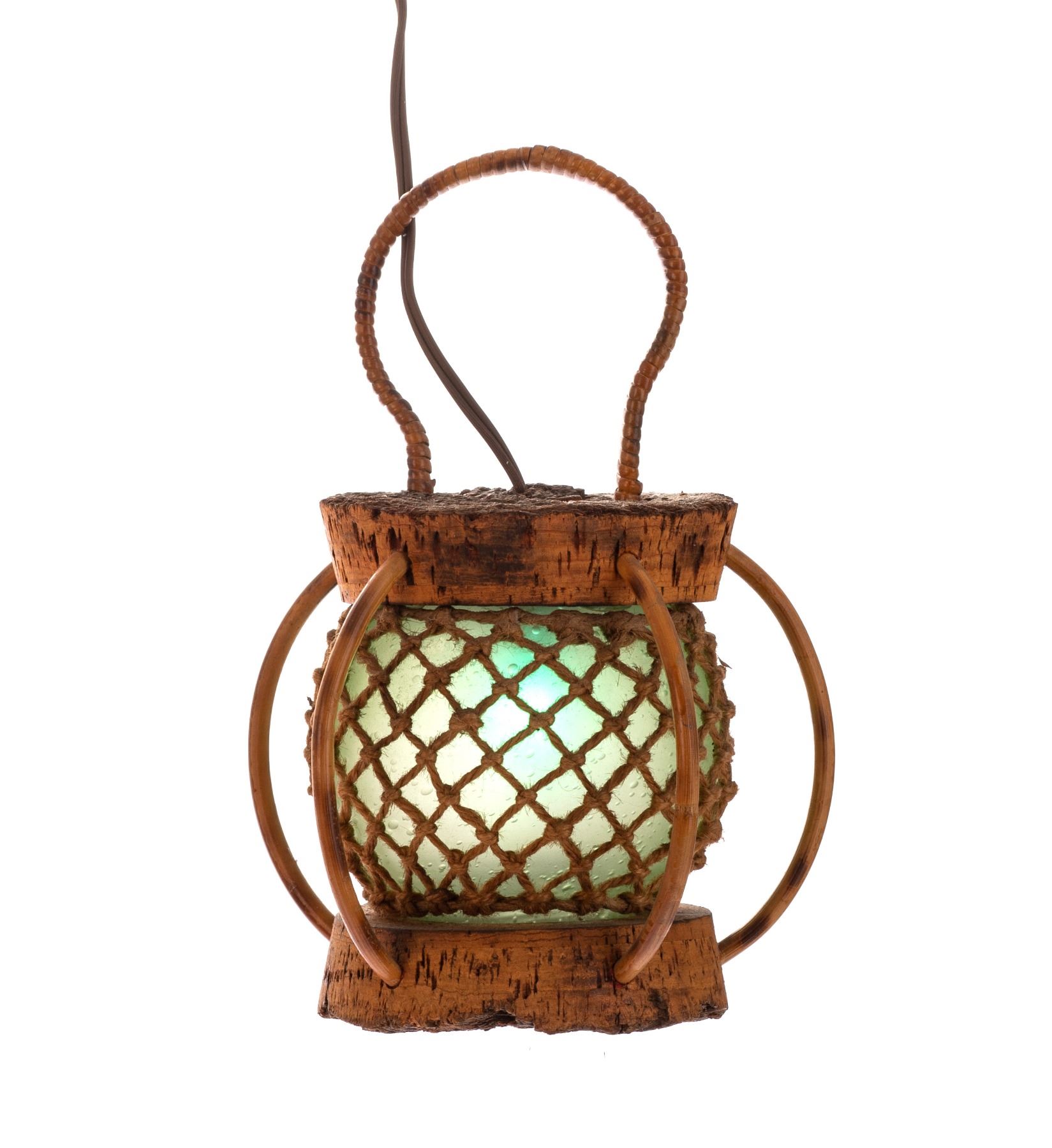 (1980s) The burned cork bottom adds an extra dimension to this blue glass float lamp with tightly wound rope wrapping and bamboo arched holders. 7.5"x10.5". VG+ with typical wear.