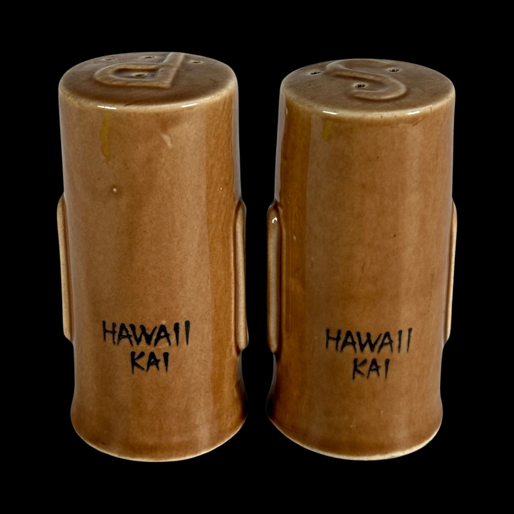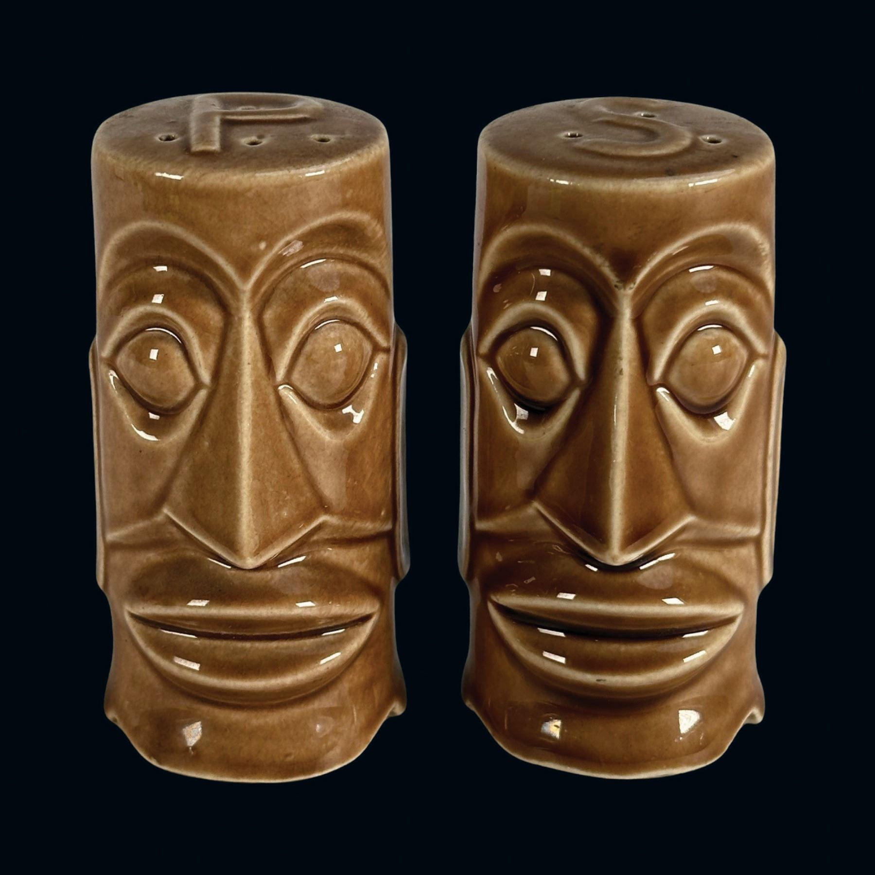 (1950s)* The famous Hawaii Kai in New York City continued to have promotional Tiki ceramics giveaways such as these stylized Moai figurals. VG+. 2.25"dia x 3.75" each.