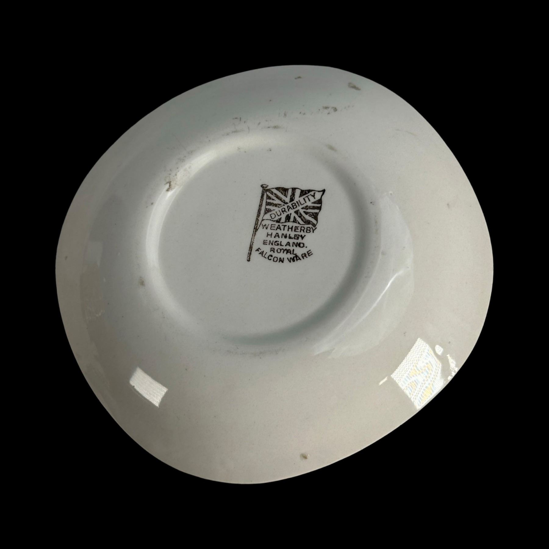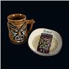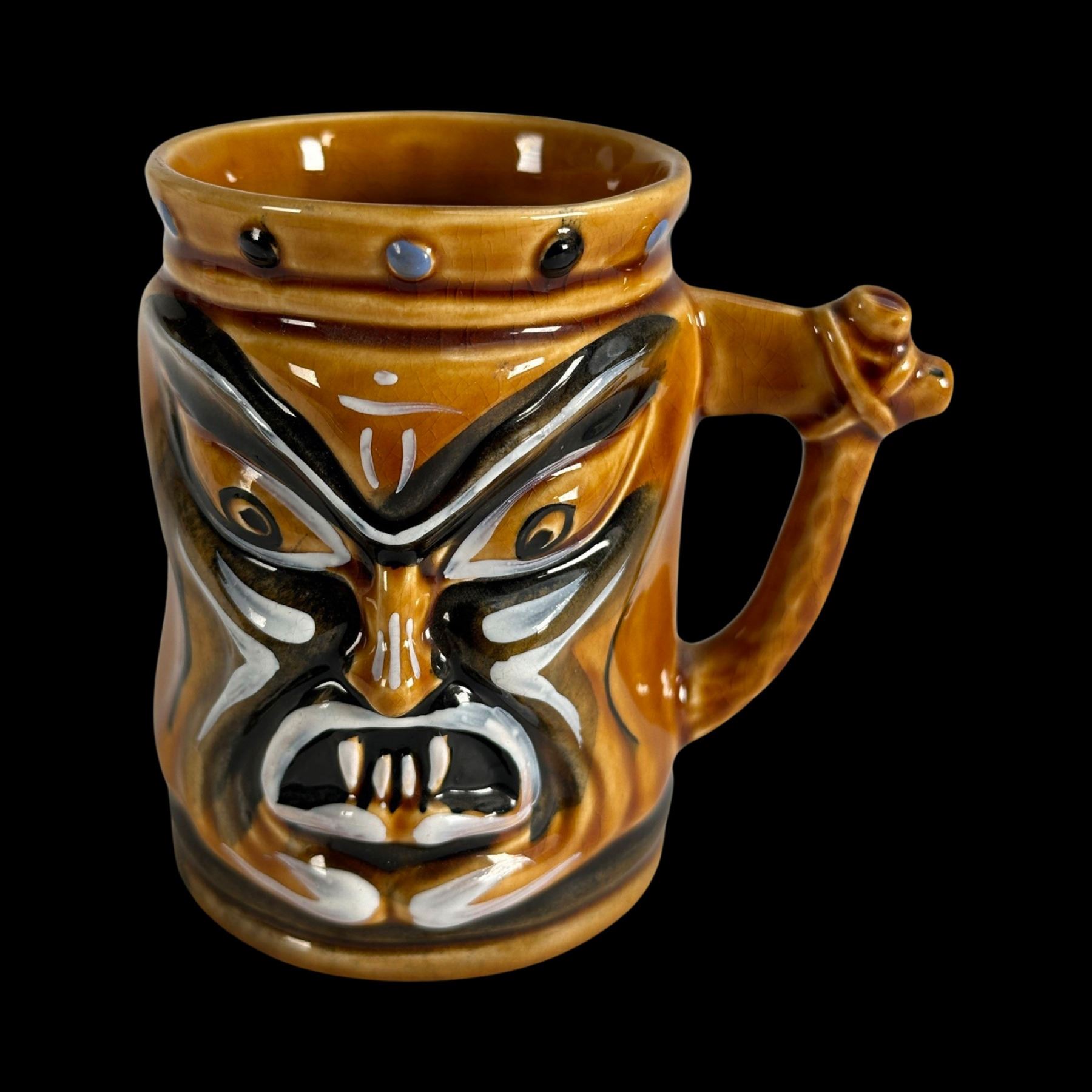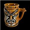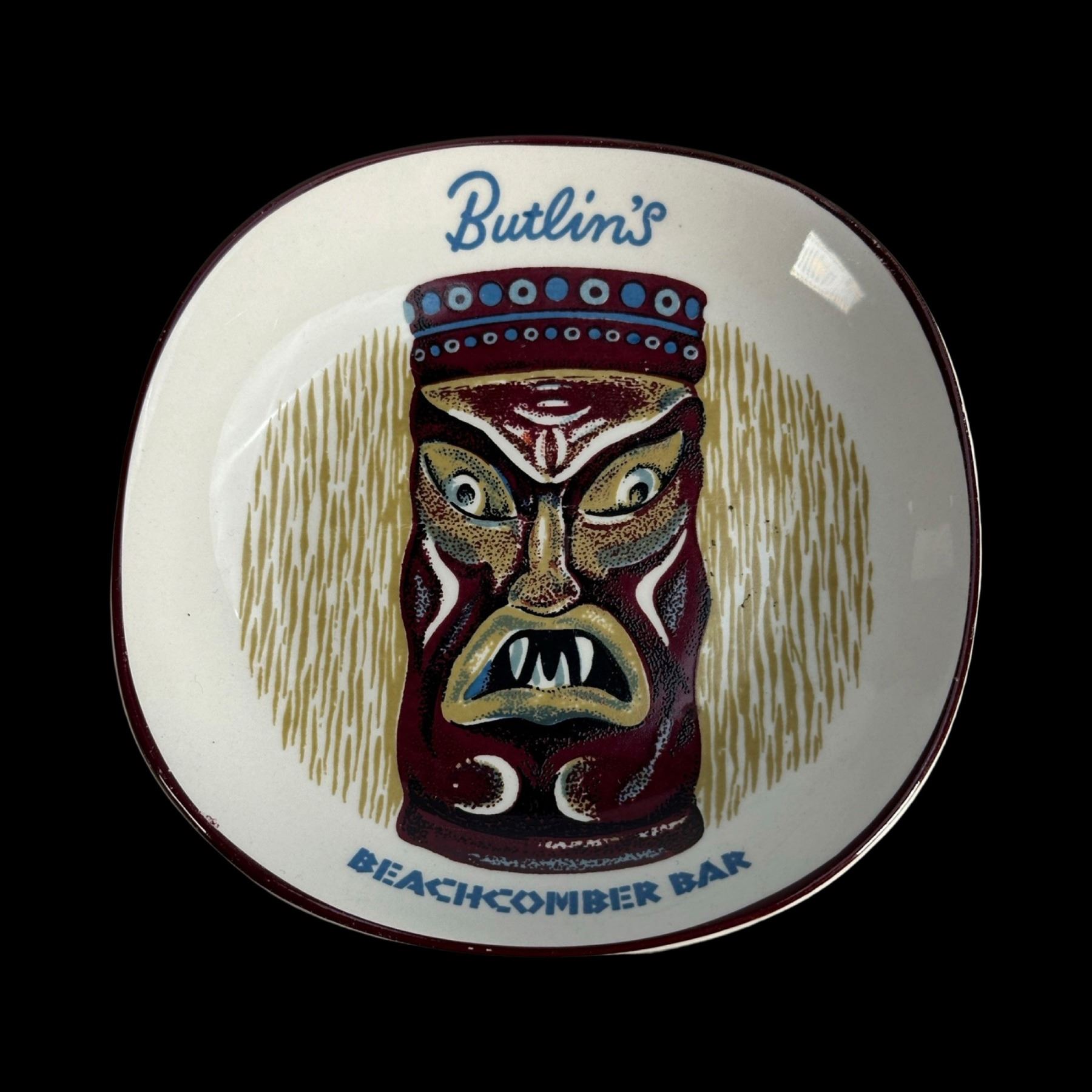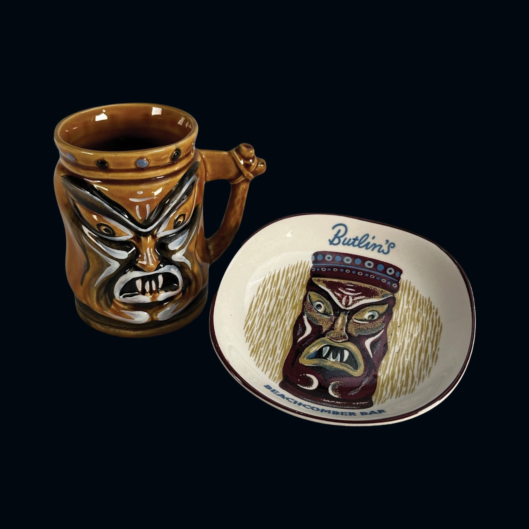 (1960s)* Butlin's was a resort in England that could be considered the equivalent of South Florida. It was a summertime escape for families where activities for kids occurred during the days and at night, the parents could let their hair down in adult escapism. The Beatles even performed a few seasons in the early years at Butlin's. The famous Beachcomber Bar and Restaurant was another kind of Tiki fantasyland, even more removed from Polynesia and seen through the foggy, inaccurate lens of British perspective. Nonetheless, a very fun place. Here are a couple of nice Tiki souvenir items from the venue. Well marked. VG+. 4.5"x4"x2.75" mug, 5"dia dish.