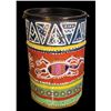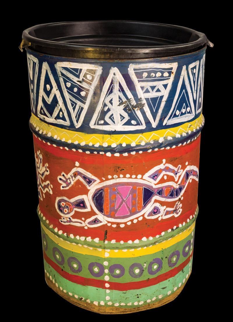 (1970s) A LeRoy repurposing of a standard steel oil drum. Here, it has been painted with a bright, fanciful Caribbean calypso theme. Has a plastic tub on top for the placement of ice and bottled beverages.30"x20"VG+ with typical wear from use