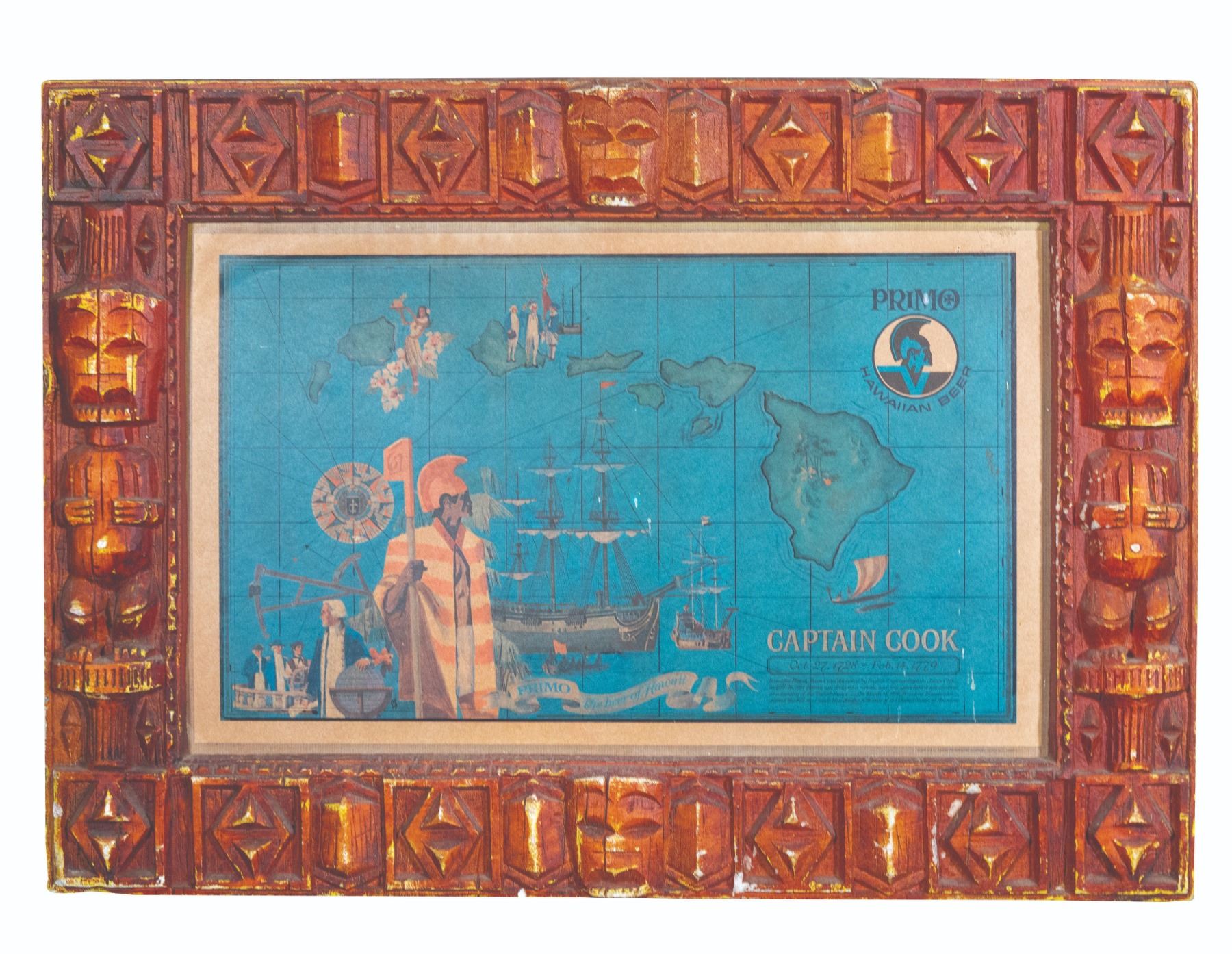 (1970s) "Primo Beer - the beer of Hawaii" sponsored advertisement Captain Cook map of Hawaii features handsome color illustrations of the islands along with American founding fathers and nautical images. Wonderfully detailed carving and painted styrofoam frame. Scarce. 28"x20". FAIR with some paint wear on frame and toning to the print.