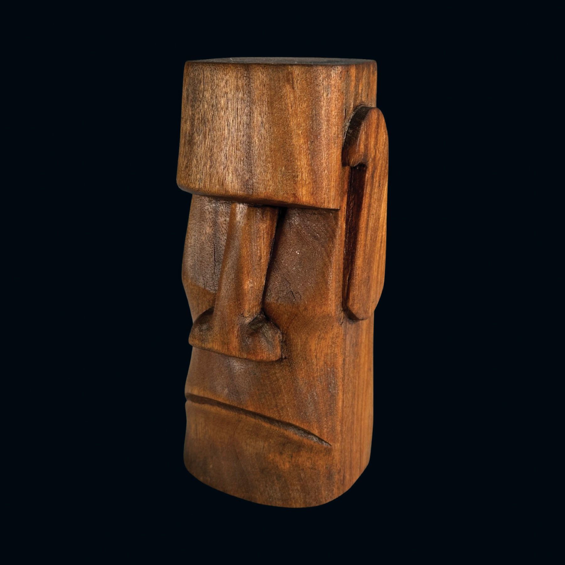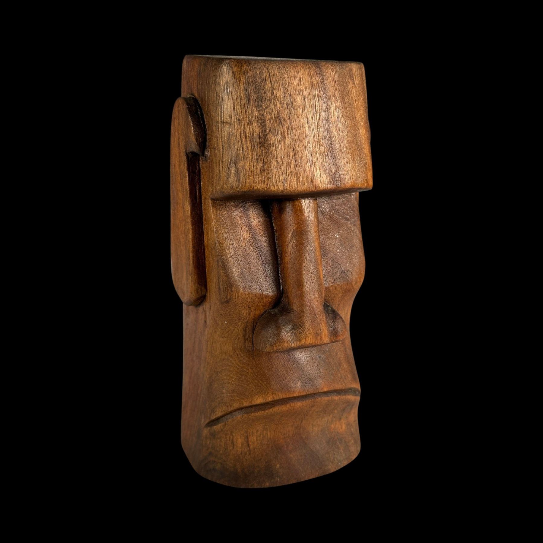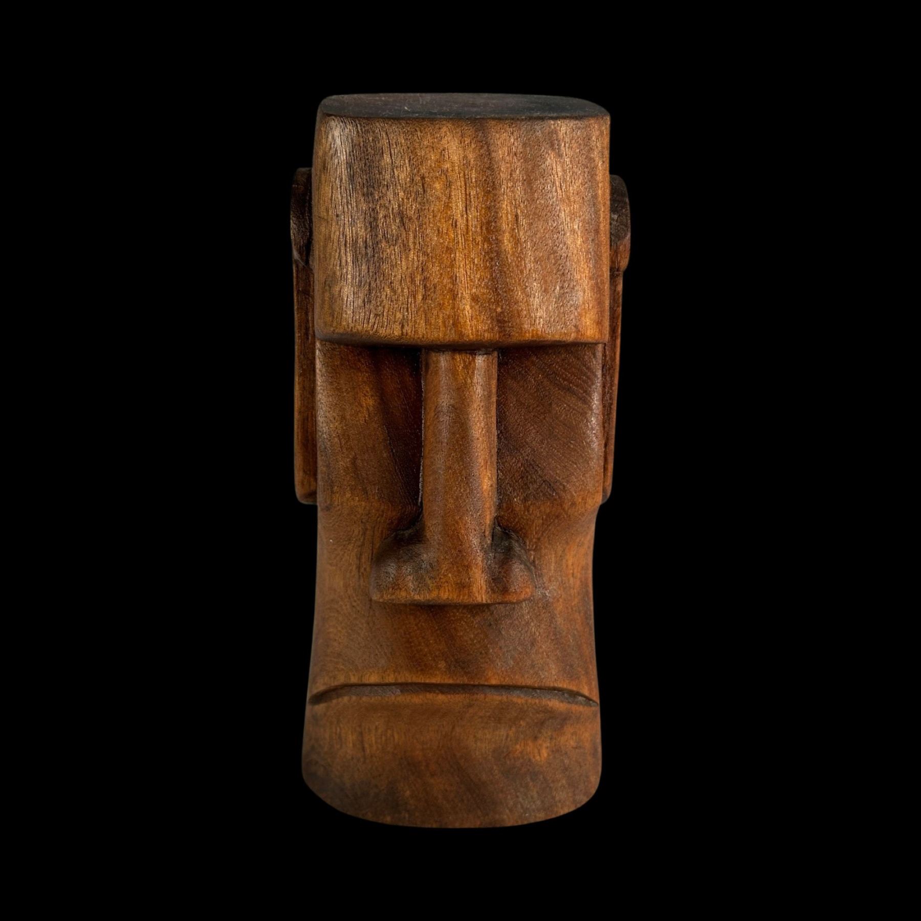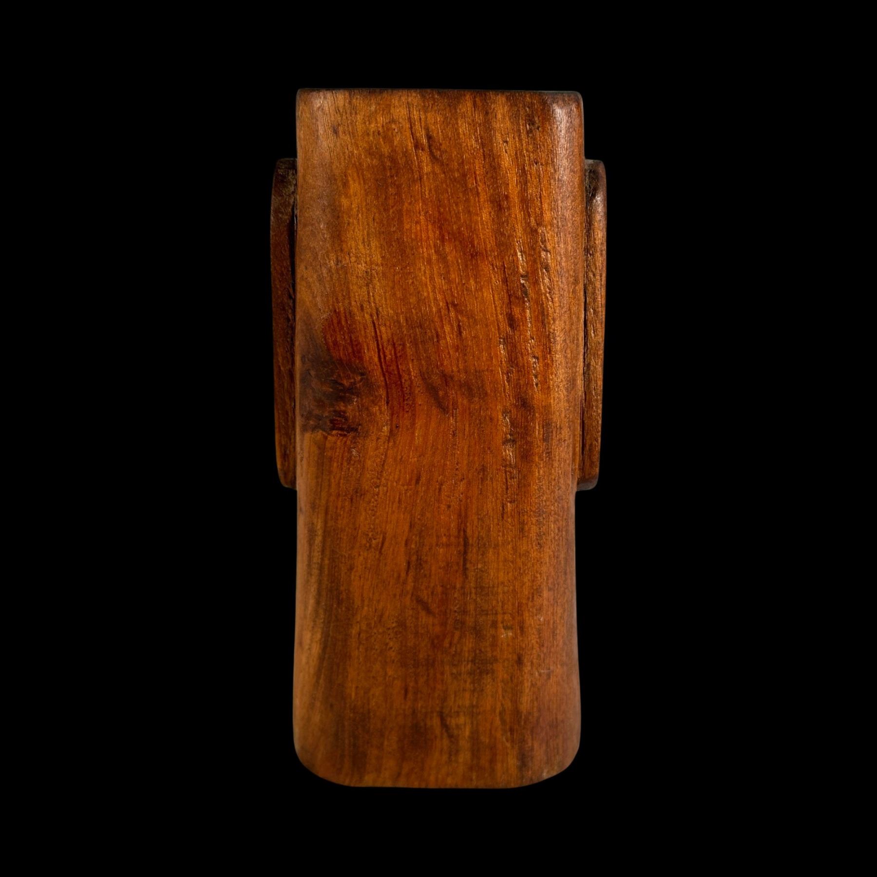 (1980s)* Sven's first table top carving bought at Benson's in Long Beach. No doubt, at this point in the 1980s, Benson's was in somewhat open competition with Oceanic Arts and this looks like a knock-off of OA's #223 AKU AKU HEAD Tiki. VG+ with typical wear. 3.5"dia x 7.25".