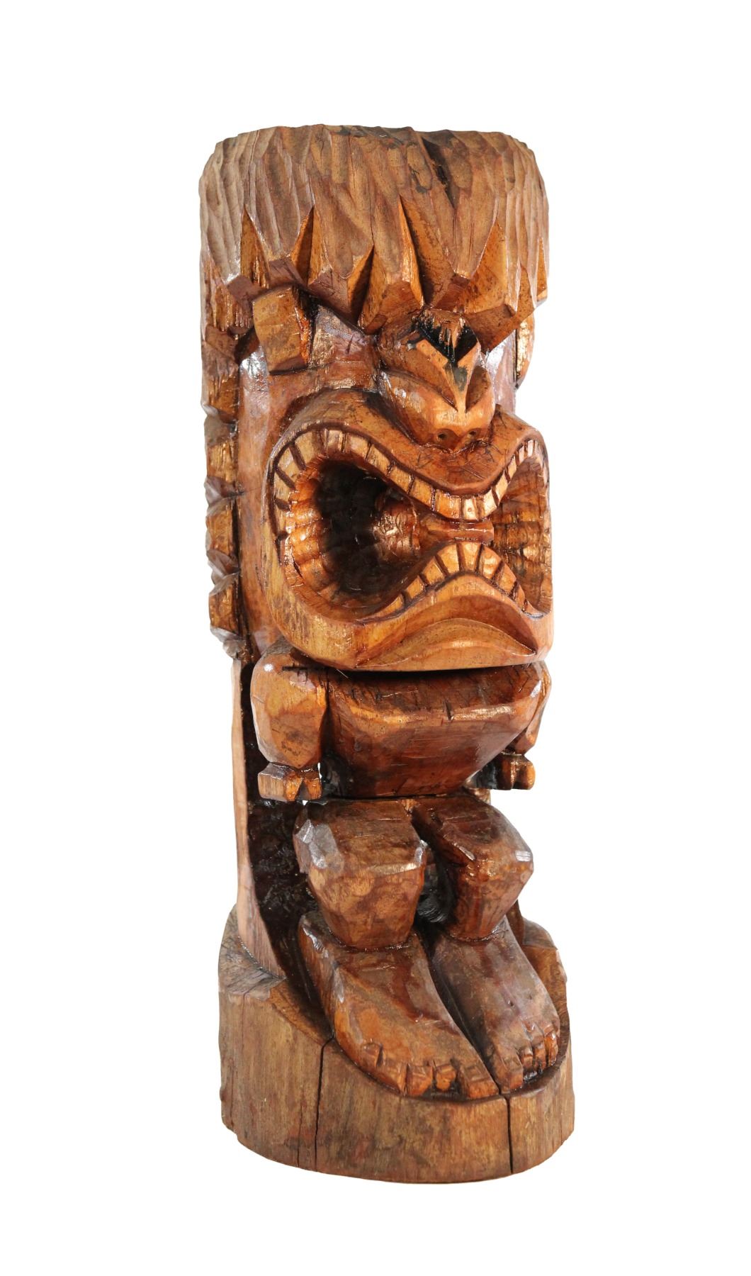 (1960s) This Kaulani Prison Tiki carving with Big Toes is hand carved, featuring natural wood bumps and grains to give a more textured look to the exaggerated facial features. Deep cut hand carved natural wood enhances the intricate craftsmanship of this Tiki figure. Wonderful detail on the mouth with revealing tongue. Solid wood. 16"x6.5". VG with typical wear.