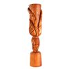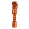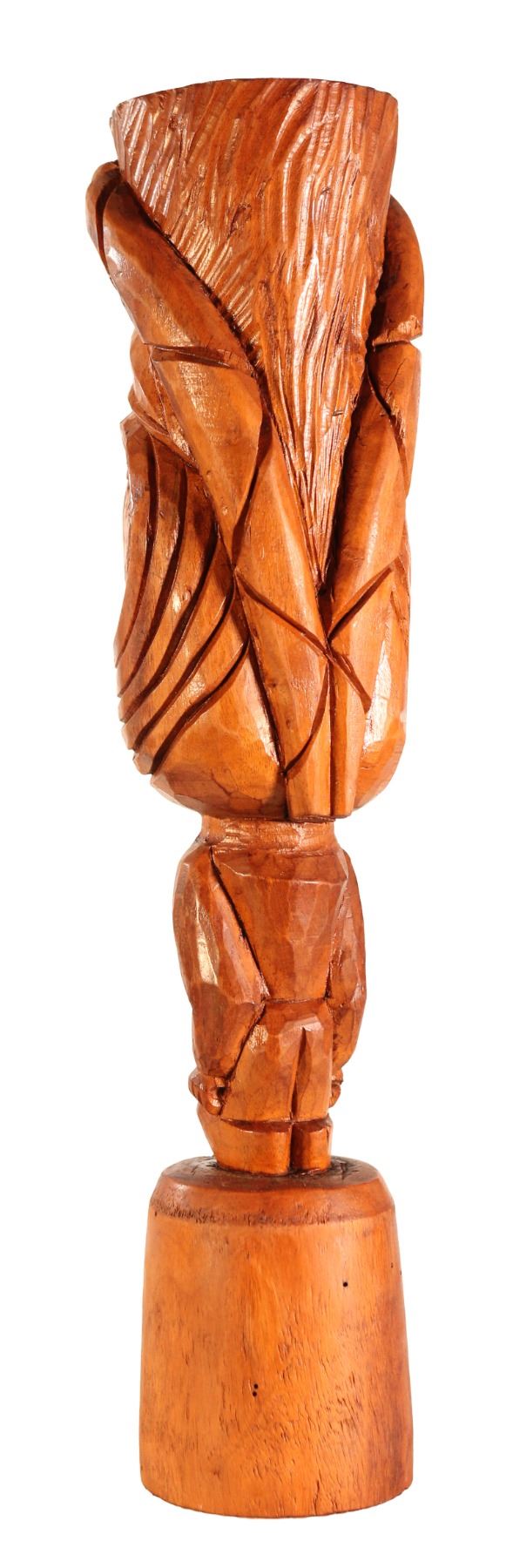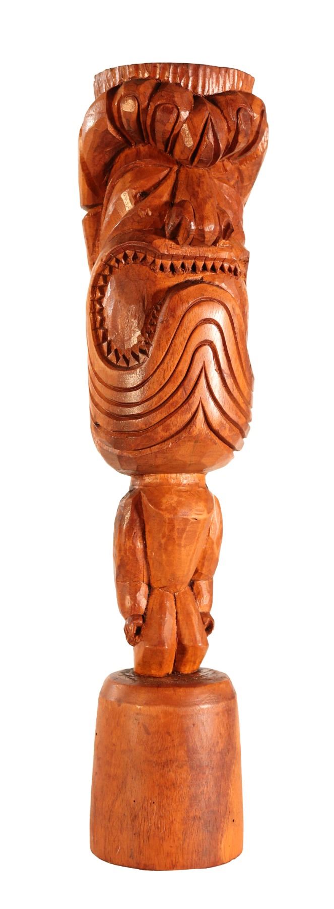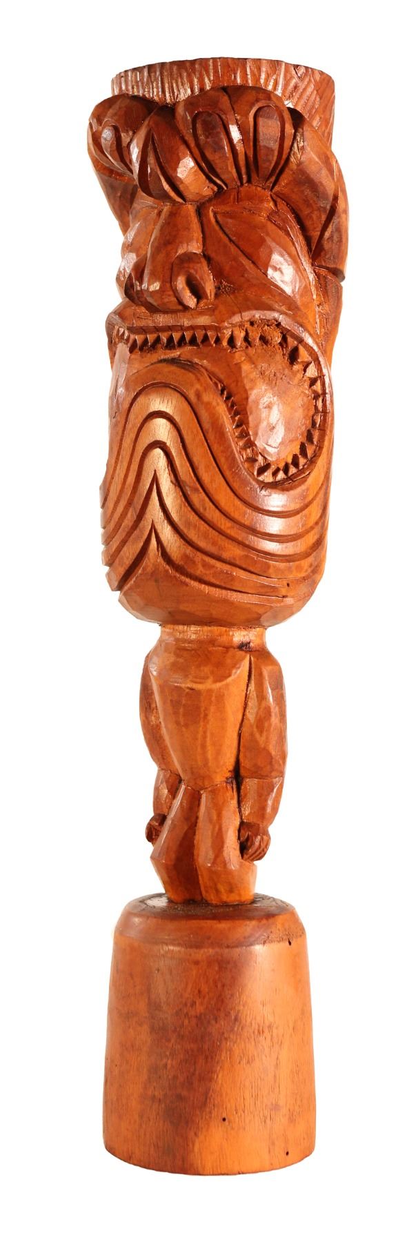 (1960s) Hand carved figure of Lono: Hawaiian God of Agriculture and Peace stands atop the land overseeing the tropical Hawaiian islands. Another variation on the Kaulani Prison style Tiki. Solid wood on double tiered base. 26"x8.5"x12". VG+.
