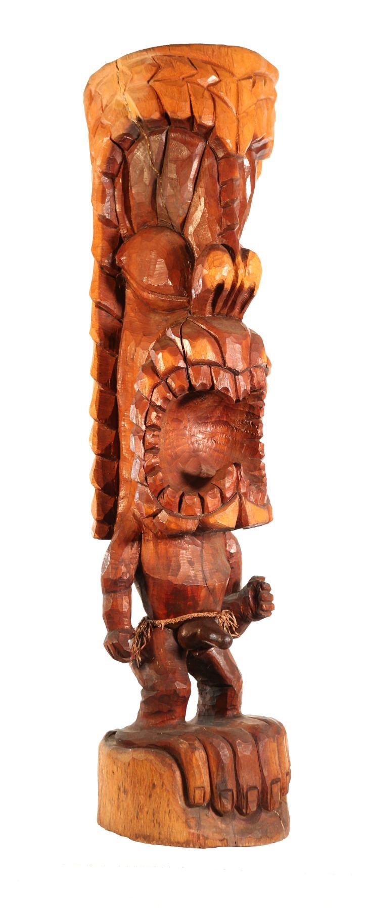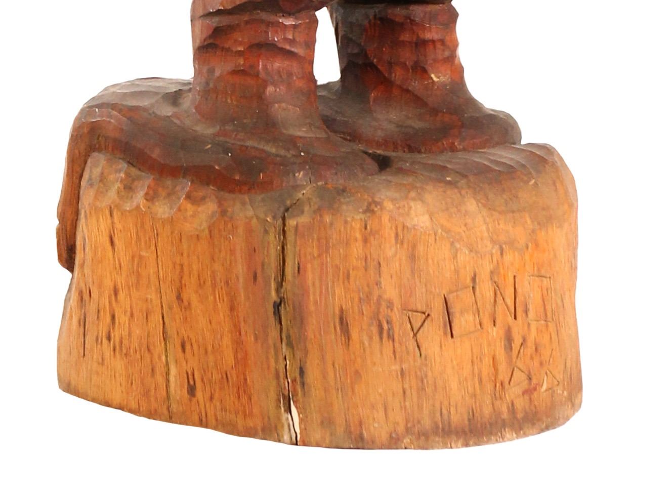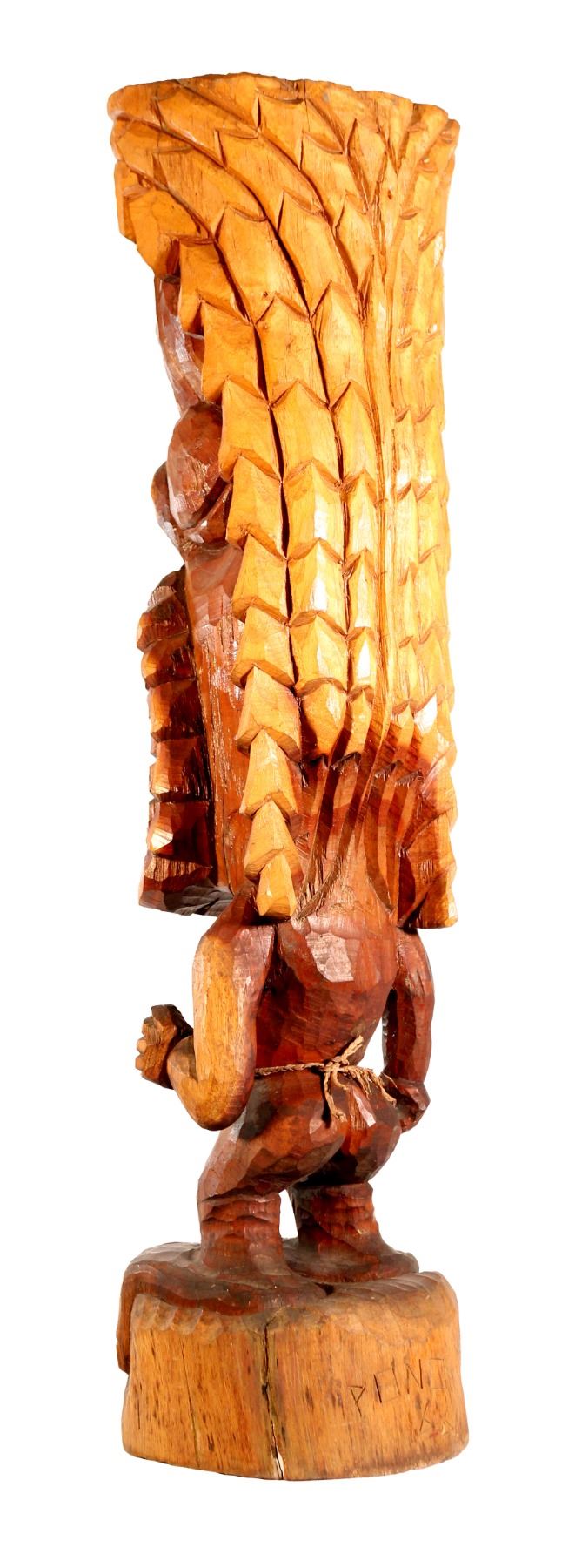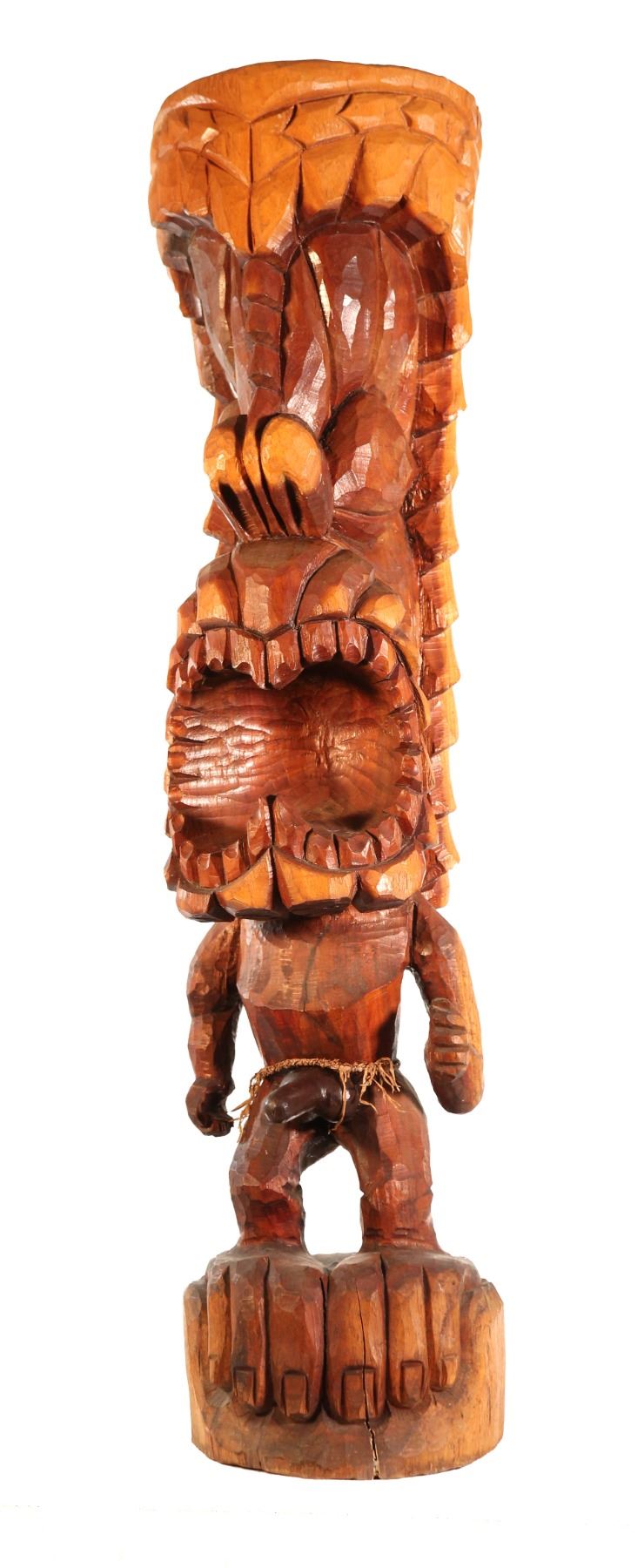 (1966).An exceptional item, this hand carved Tiki features skilled, intricate carving detail to create a striking image. One of the more unusual of the Prison Tiki figures features an erect phallus and wide open jagged teeth with tightly-woven waistband. Solid wood with "Pono 66" carved on back. 37"x9". VG+.